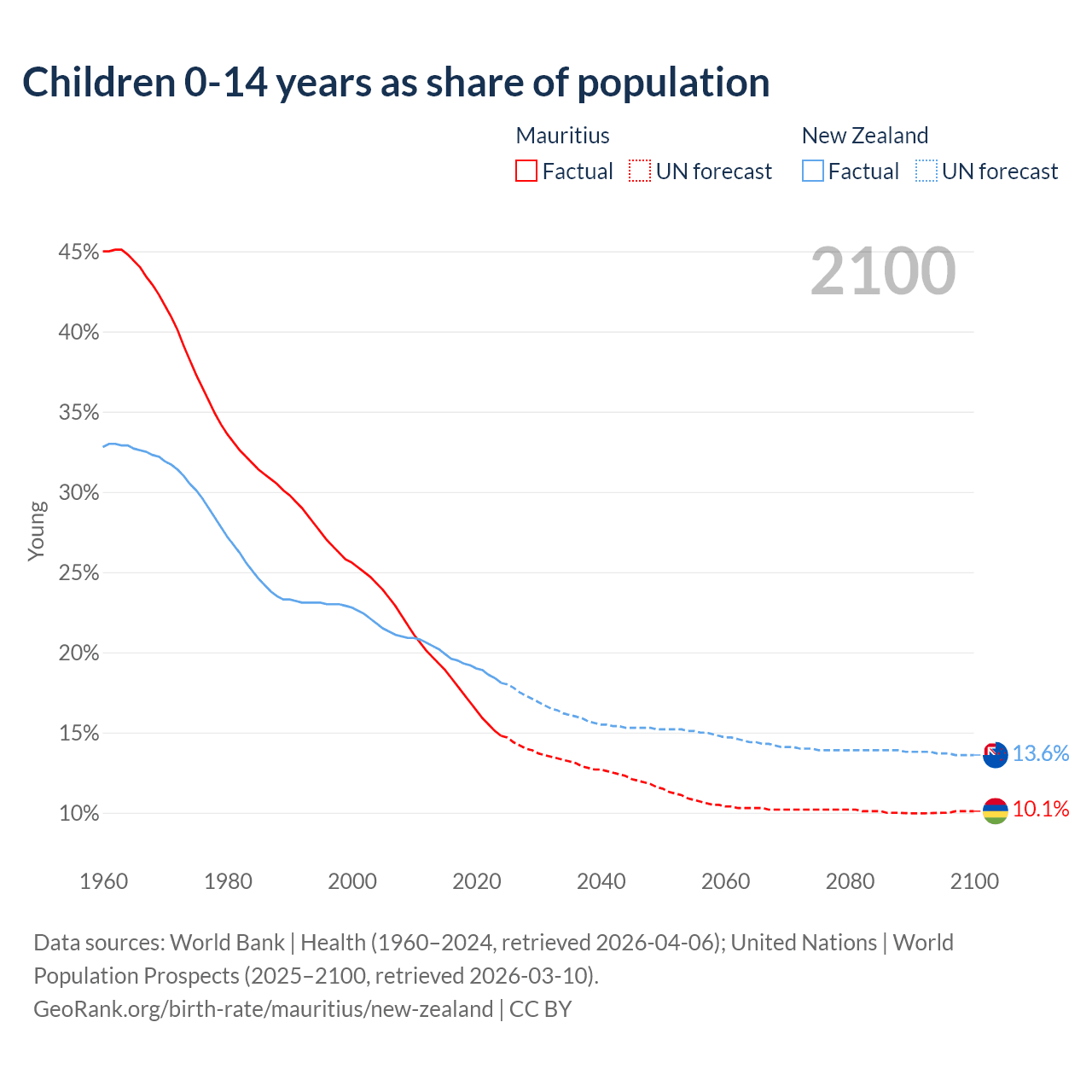 According to the latest available data on birth rates, the fertility rate in Mauritius was 1.39 children per woman in 2023, compared to 1.56 in New Zealand in 2023. The replacement level is considered to be 2.1 children per woman.