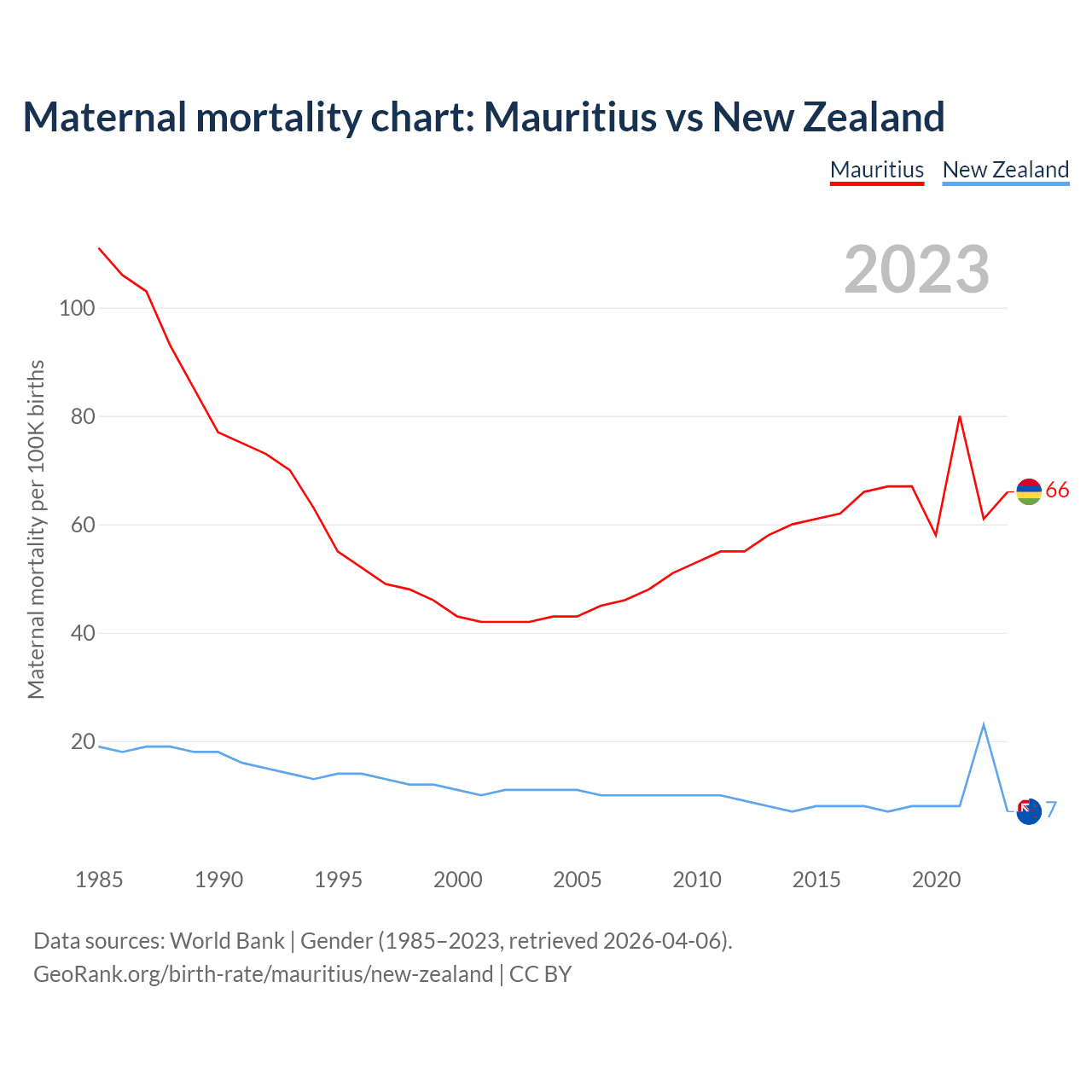 The maternal mortality rate, which is the probability of dying during childbirth or within 42 days of pregnancy termination, is 66 deaths per 100,000 live births in Mauritius, compared to 7 deaths in New Zealand.