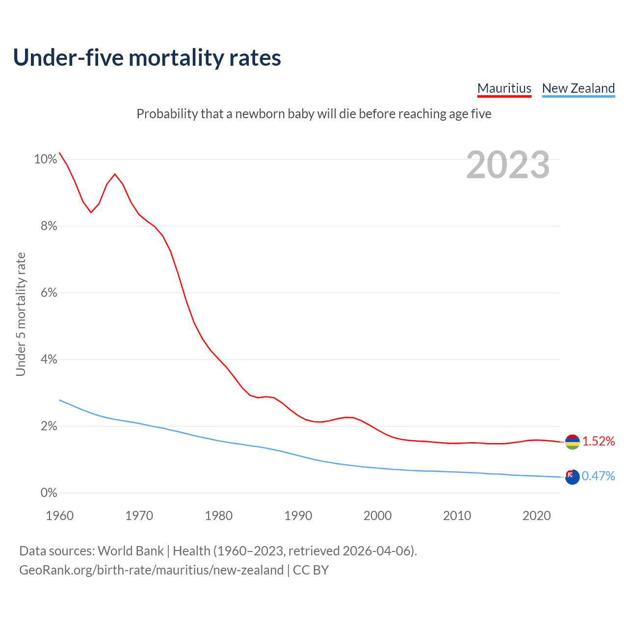 The chance that a newborn baby will die before reaching age five is 1.52% in Mauritius and 0.47% in New Zealand. Above is a chart with historical data on under-five mortality rates.