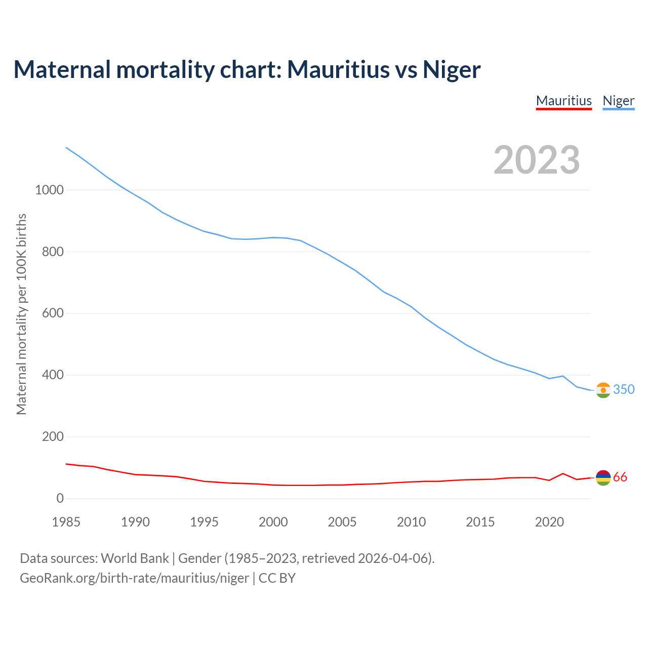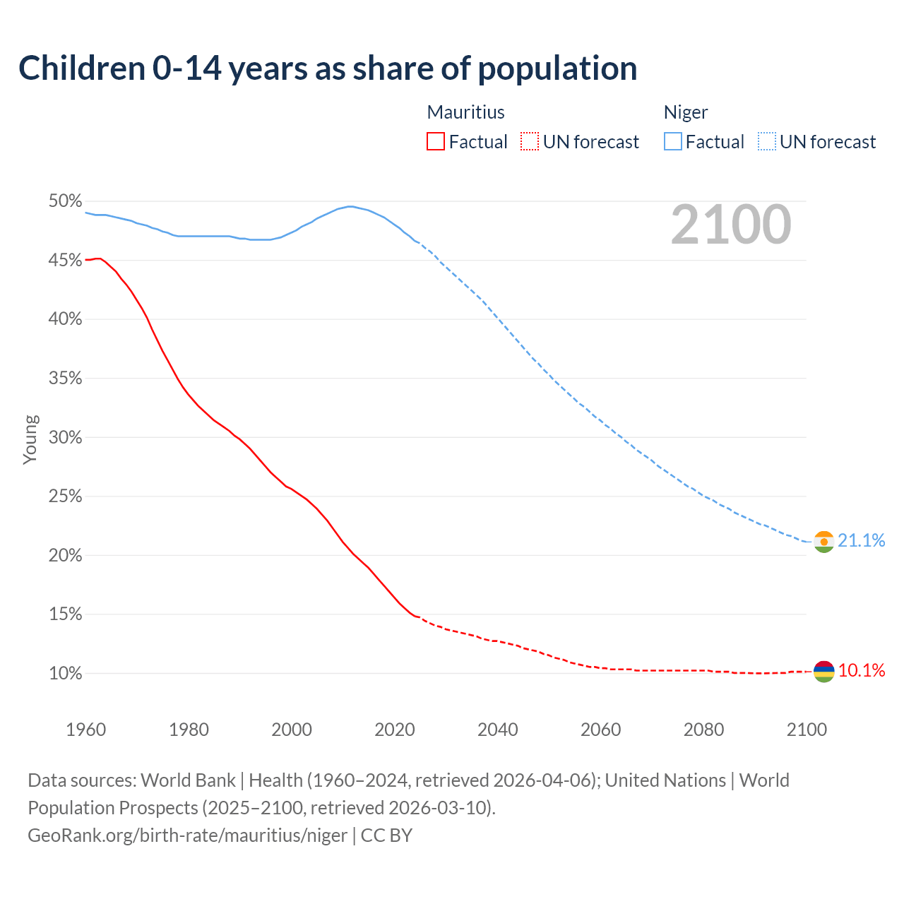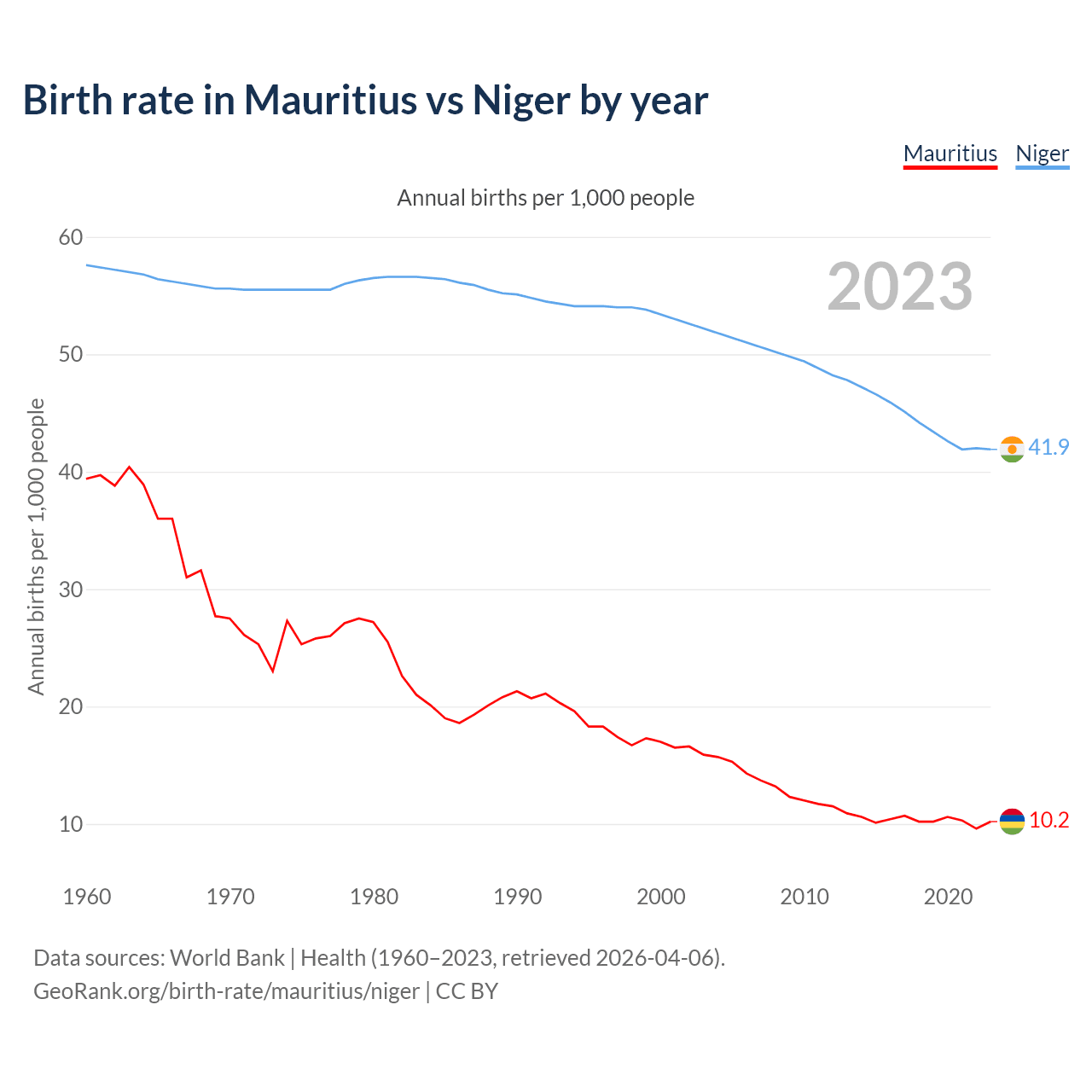 Mauritius has an annual birth rate of 10.2 births per 1,000 people, compared to 41.9 for Niger. The average number of children a woman is expected to have during her lifetime — the fertility rate, is 1.39 in Mauritius and 6.06 in Niger — 336% difference.