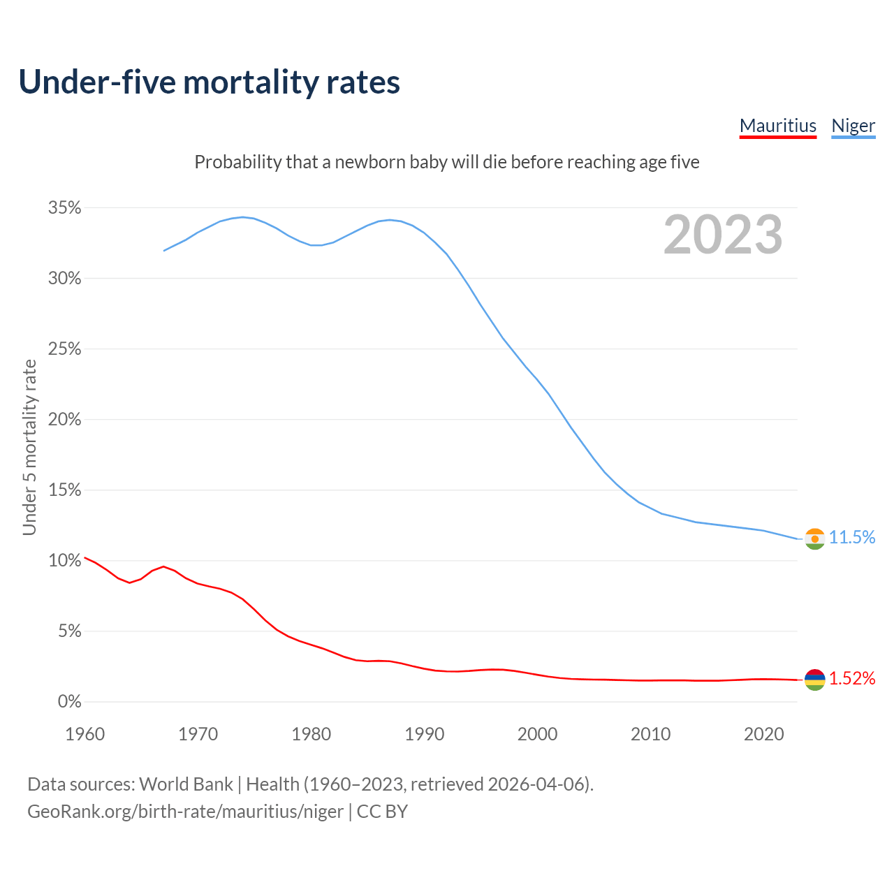 The chance that a newborn baby will die before reaching age five is 1.52% in Mauritius and 11.5% in Niger. Above is a chart with historical data on under-five mortality rates.