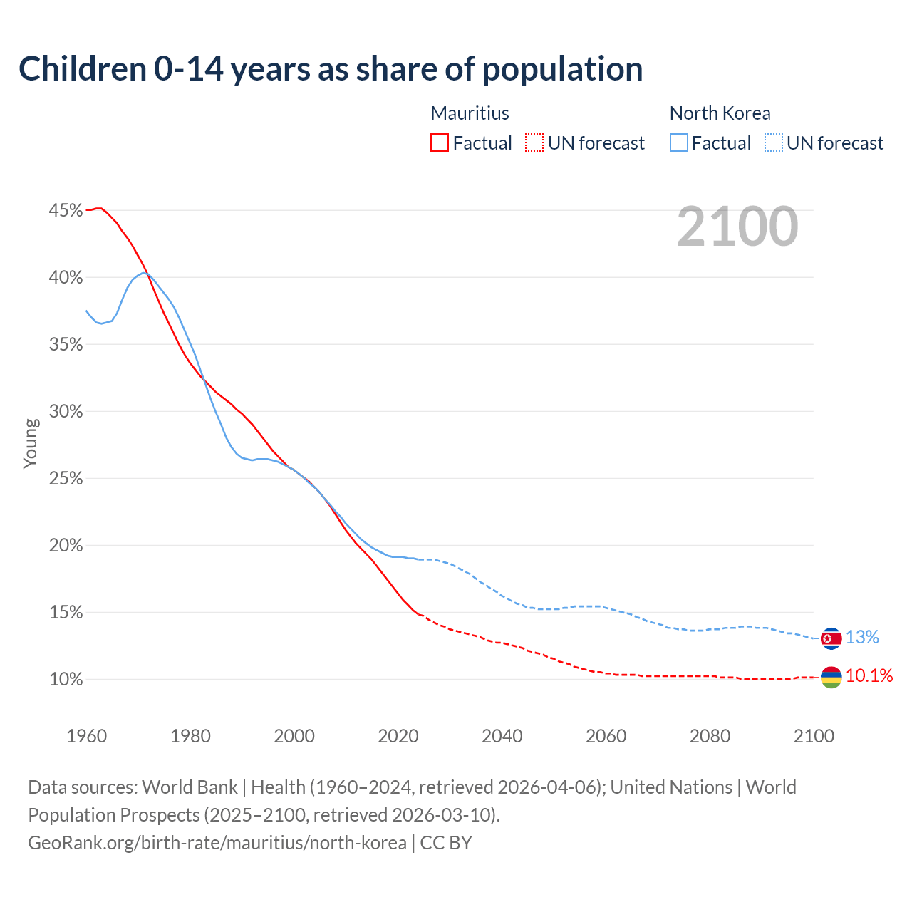 According to the latest available data on birth rates, the fertility rate in Mauritius was 1.39 children per woman in 2023, compared to 1.78 in North Korea in 2023. The replacement level is considered to be 2.1 children per woman.