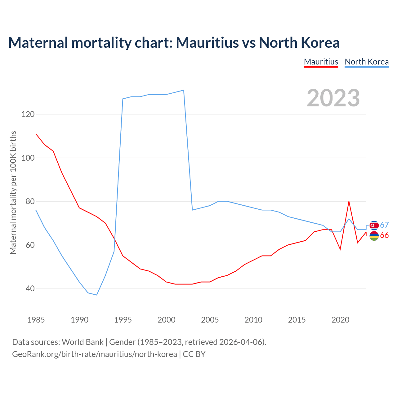 The maternal mortality rate, which is the probability of dying during childbirth or within 42 days of pregnancy termination, is 66 deaths per 100,000 live births in Mauritius, compared to 67 deaths in North Korea.