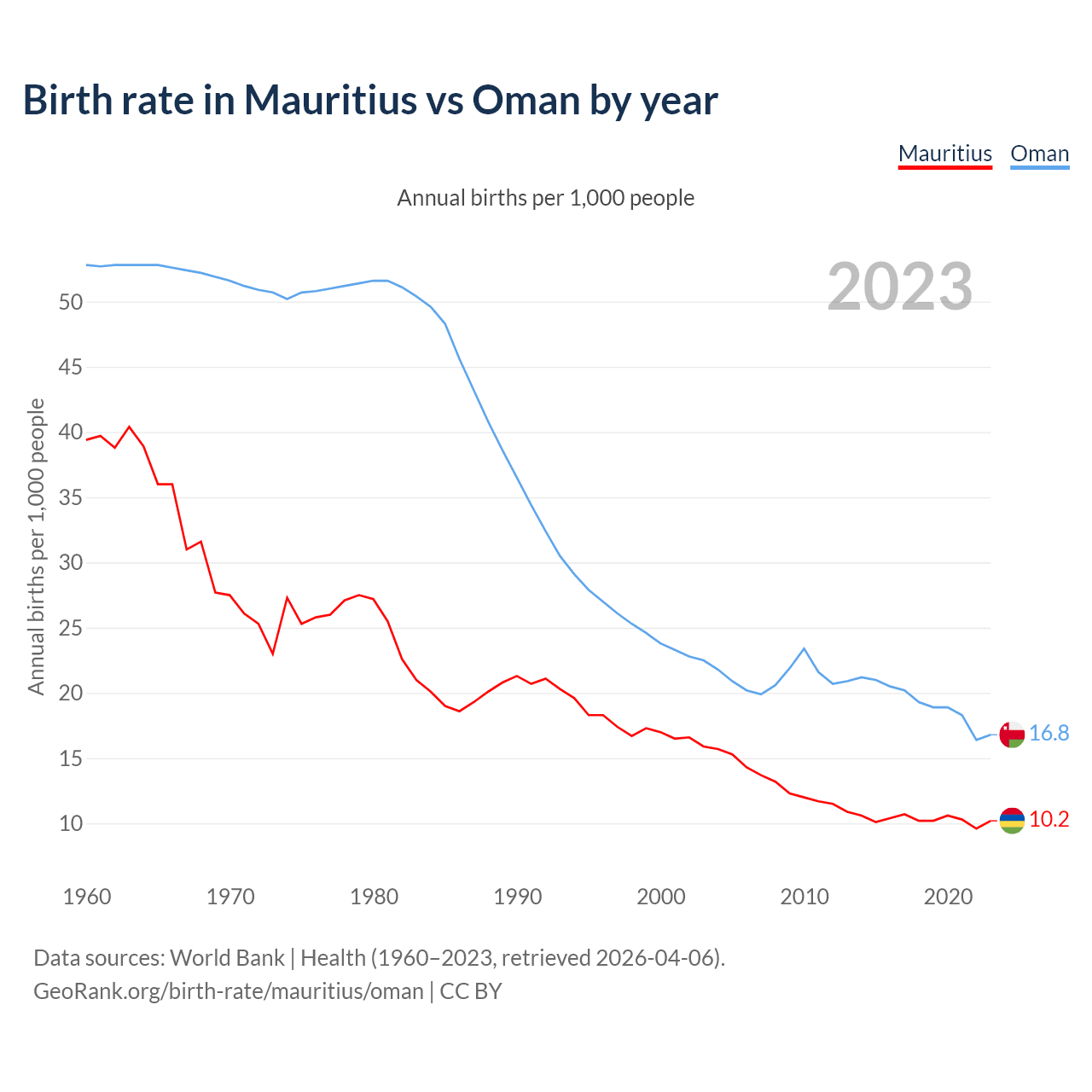 Mauritius has an annual birth rate of 10.2 births per 1,000 people, compared to 16.8 for Oman. The average number of children a woman is expected to have during her lifetime — the fertility rate, is 1.39 in Mauritius and 2.53 in Oman — 81.7% difference.