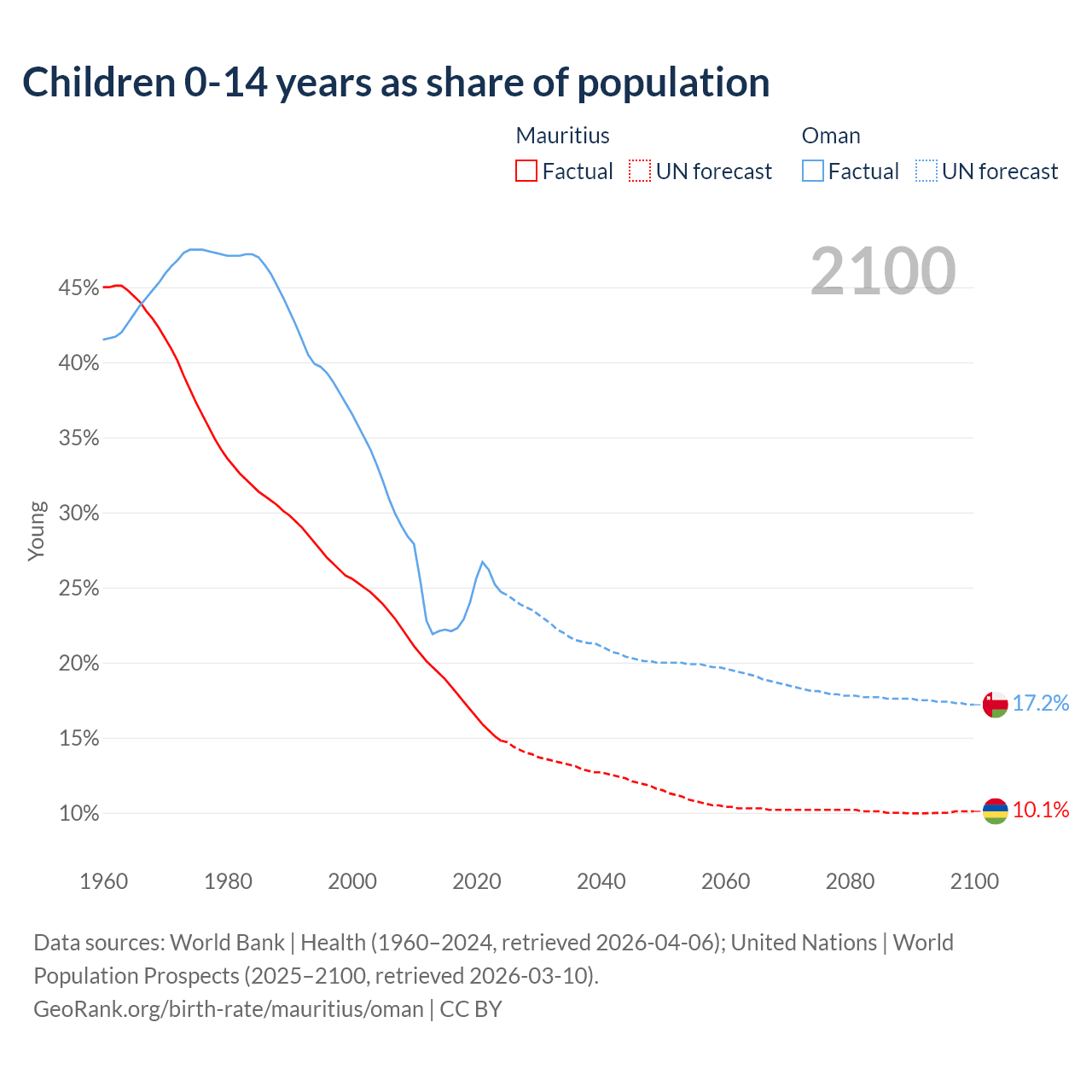 According to the latest available data on birth rates, the fertility rate in Mauritius was 1.39 children per woman in 2023, compared to 2.53 in Oman in 2023. The replacement level is considered to be 2.1 children per woman.