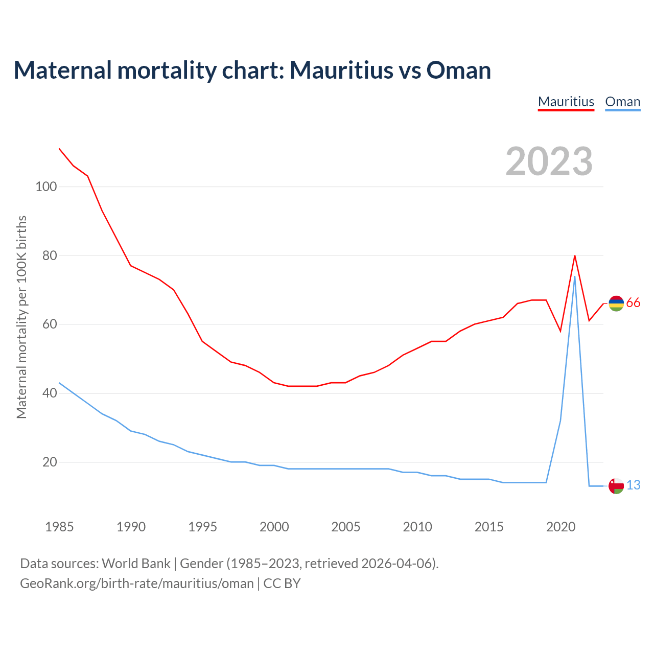 The maternal mortality rate, which is the probability of dying during childbirth or within 42 days of pregnancy termination, is 66 deaths per 100,000 live births in Mauritius, compared to 13 deaths in Oman.