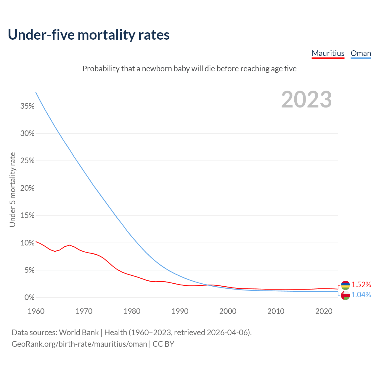 The chance that a newborn baby will die before reaching age five is 1.52% in Mauritius and 1.04% in Oman. Above is a chart with historical data on under-five mortality rates.