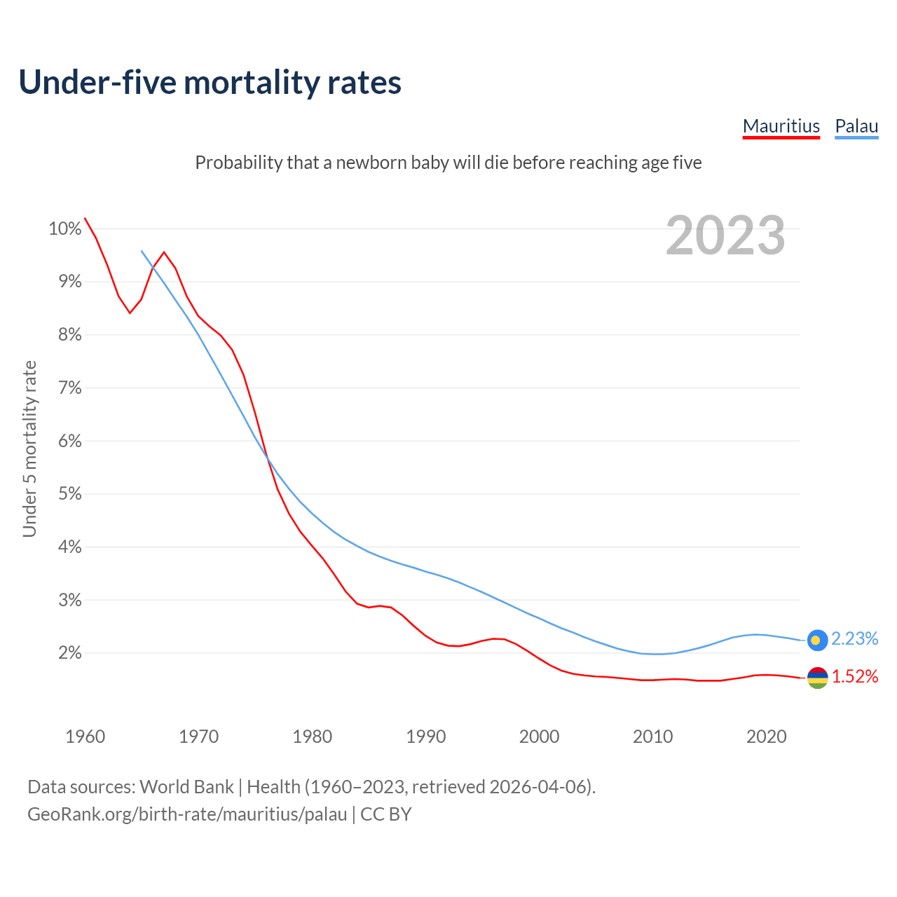The chance that a newborn baby will die before reaching age five is 1.52% in Mauritius and 2.23% in Palau. Above is a chart with historical data on under-five mortality rates.