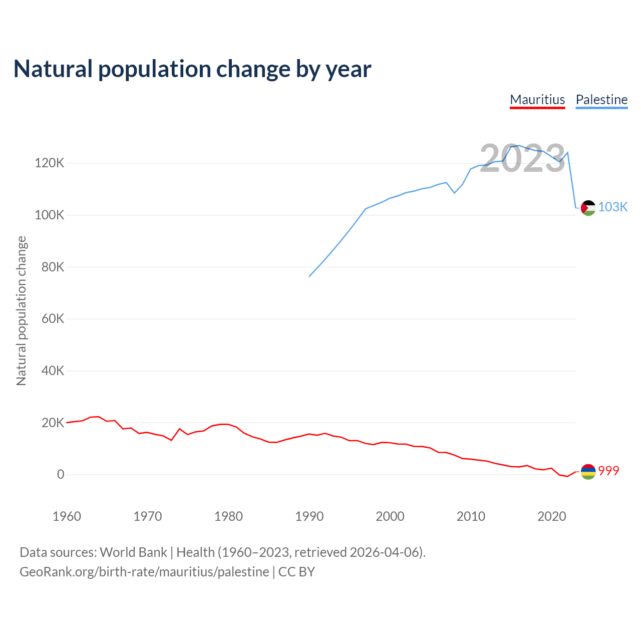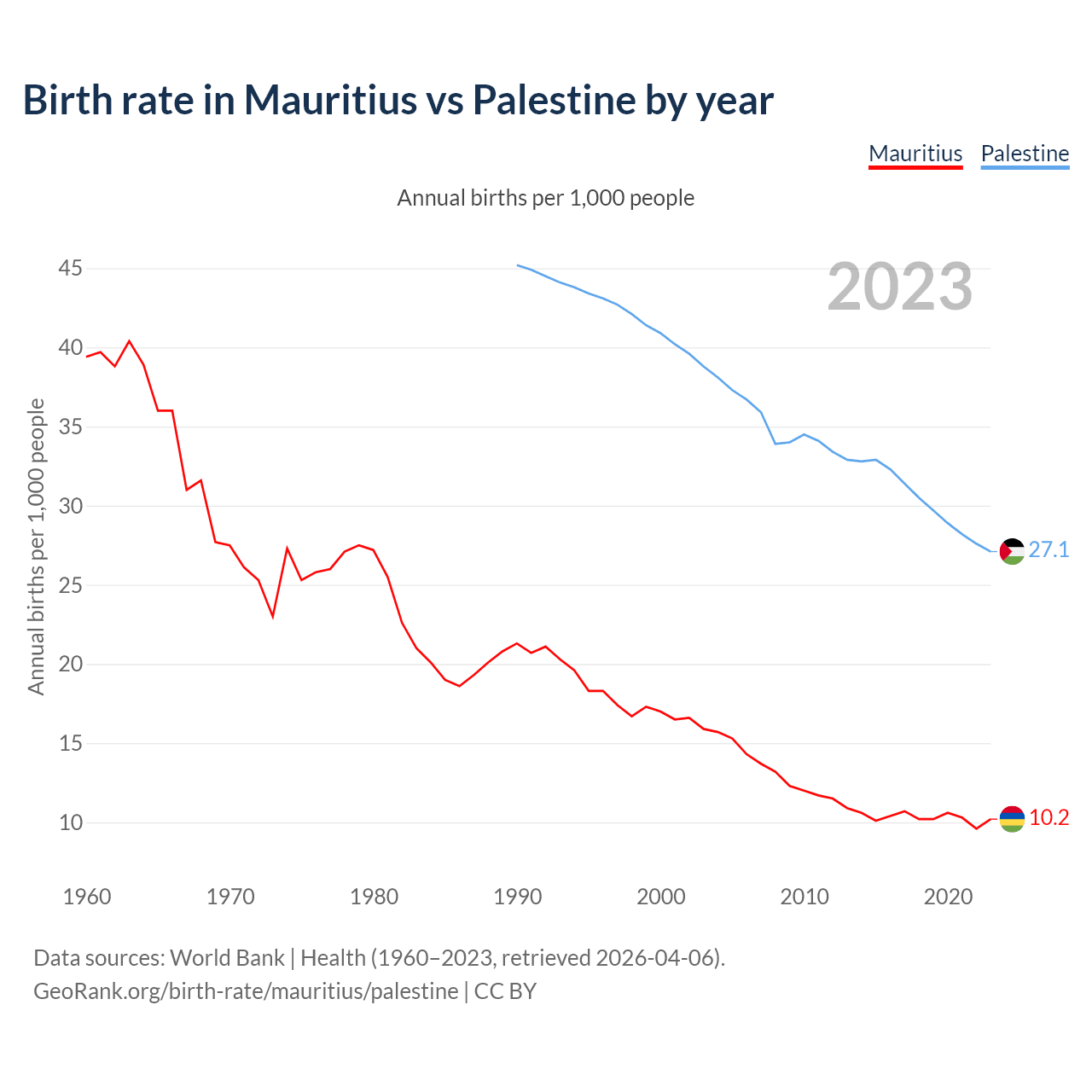 Mauritius has an annual birth rate of 10.2 births per 1,000 people, compared to 27.1 for Palestine. The average number of children a woman is expected to have during her lifetime — the fertility rate, is 1.39 in Mauritius and 3.31 in Palestine — 138.2% difference.