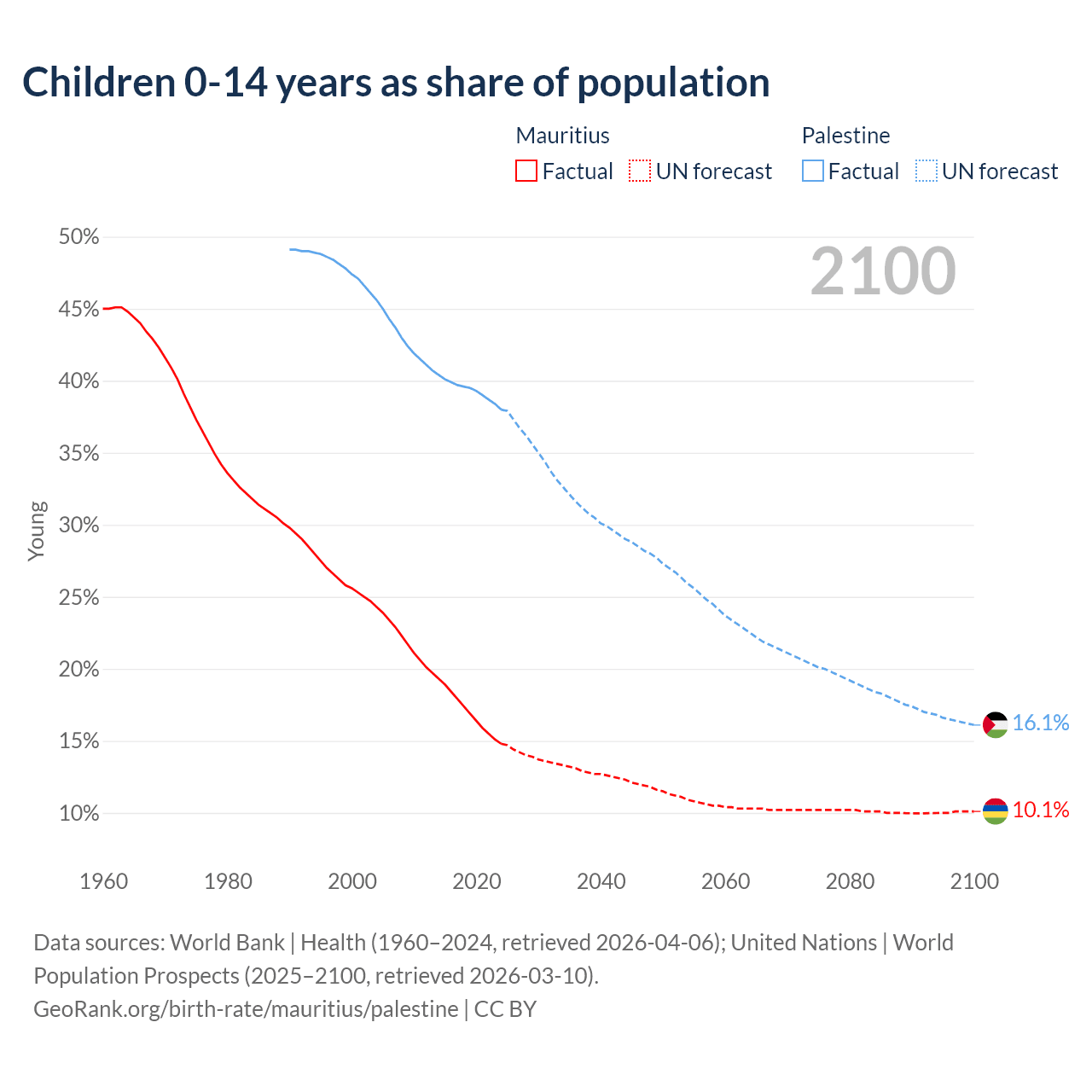 According to the latest available data on birth rates, the fertility rate in Mauritius was 1.39 children per woman in 2023, compared to 3.31 in Palestine in 2023. The replacement level is considered to be 2.1 children per woman.