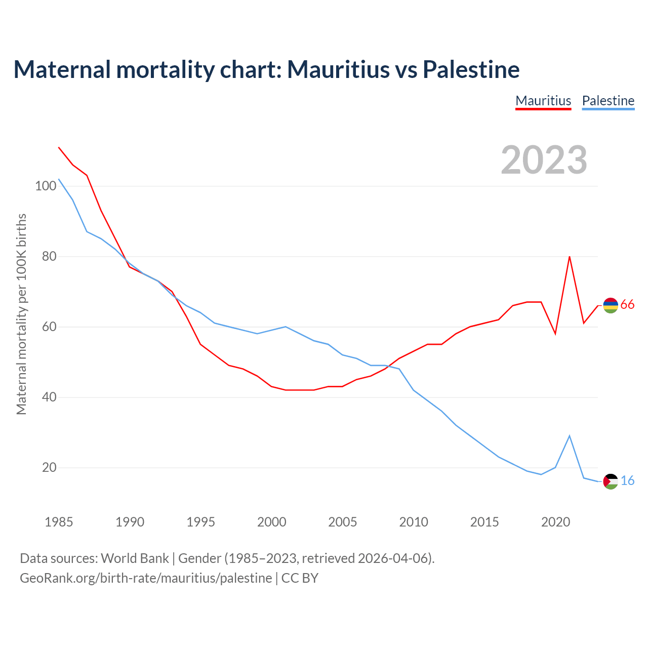 The maternal mortality rate, which is the probability of dying during childbirth or within 42 days of pregnancy termination, is 66 deaths per 100,000 live births in Mauritius, compared to 16 deaths in Palestine.