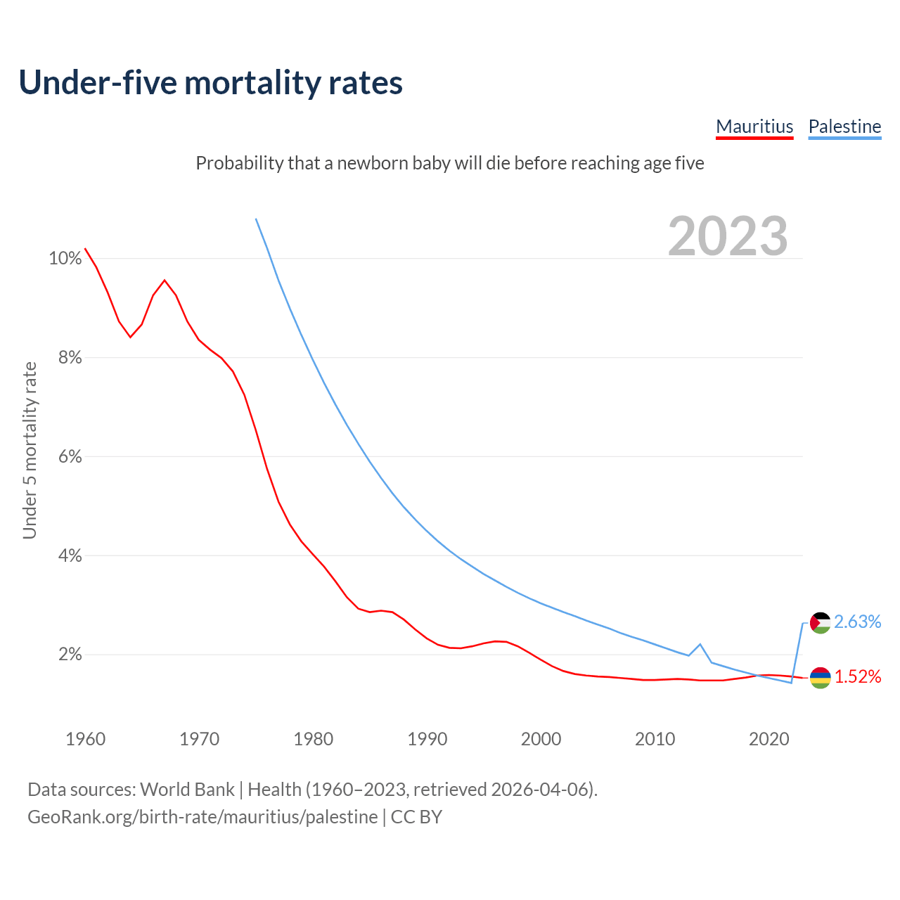 The chance that a newborn baby will die before reaching age five is 1.52% in Mauritius and 2.63% in Palestine. Above is a chart with historical data on under-five mortality rates.
