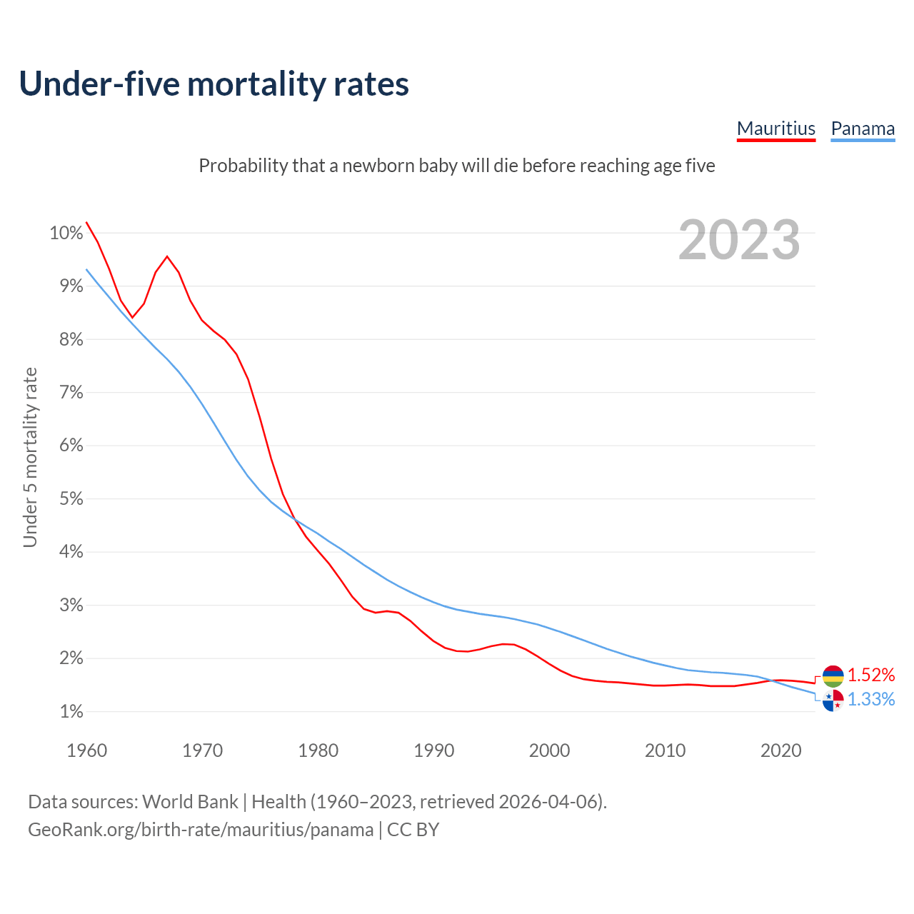 The chance that a newborn baby will die before reaching age five is 1.52% in Mauritius and 1.33% in Panama. Above is a chart with historical data on under-five mortality rates.