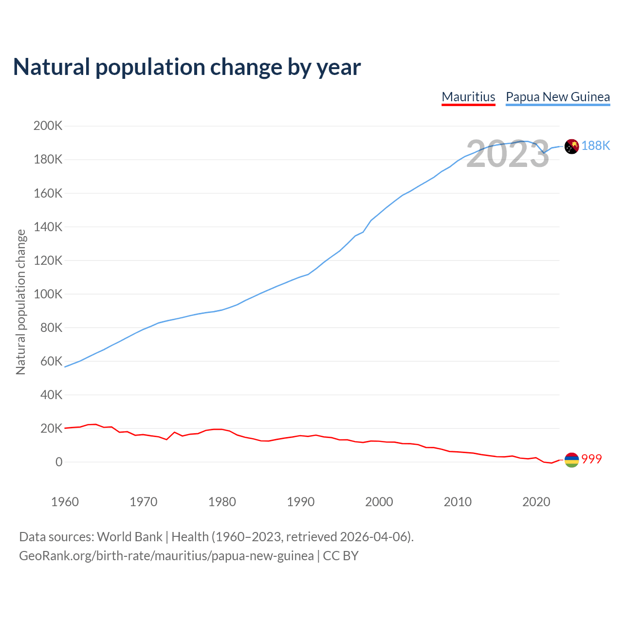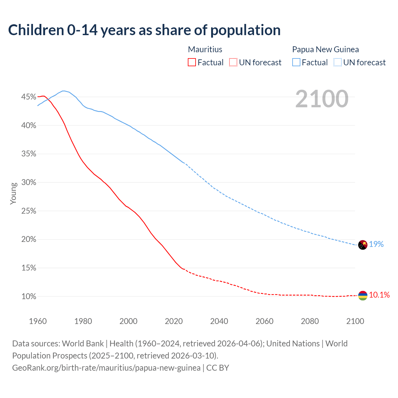 Mauritius has an annual birth rate of 10.2 births per 1,000 people, compared to 24.6 for Papua New Guinea. The average number of children a woman is expected to have during her lifetime — the fertility rate, is 1.39 in Mauritius and 3.1 in Papua New Guinea — 122.9% difference.