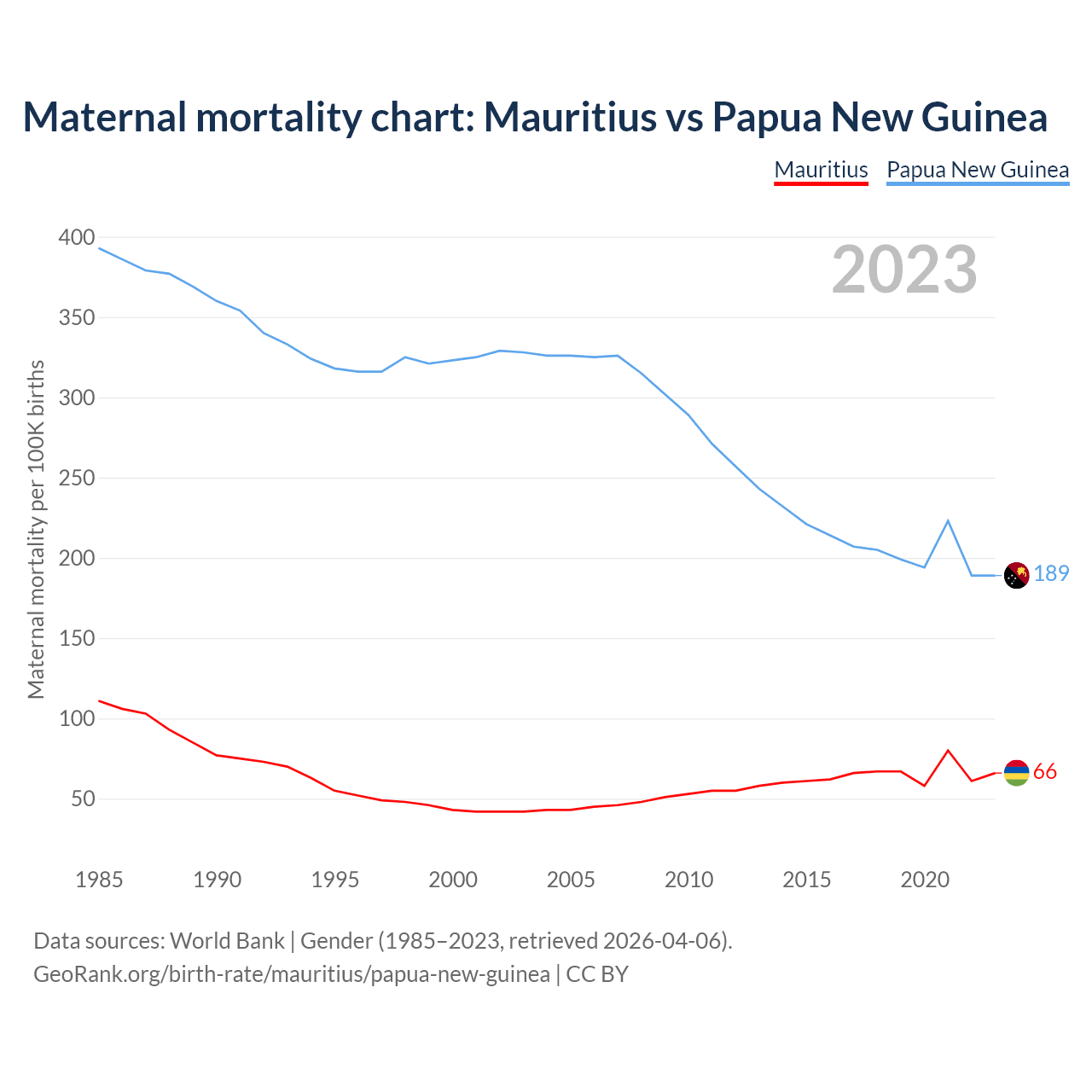 The maternal mortality rate, which is the probability of dying during childbirth or within 42 days of pregnancy termination, is 66 deaths per 100,000 live births in Mauritius, compared to 189 deaths in Papua New Guinea.