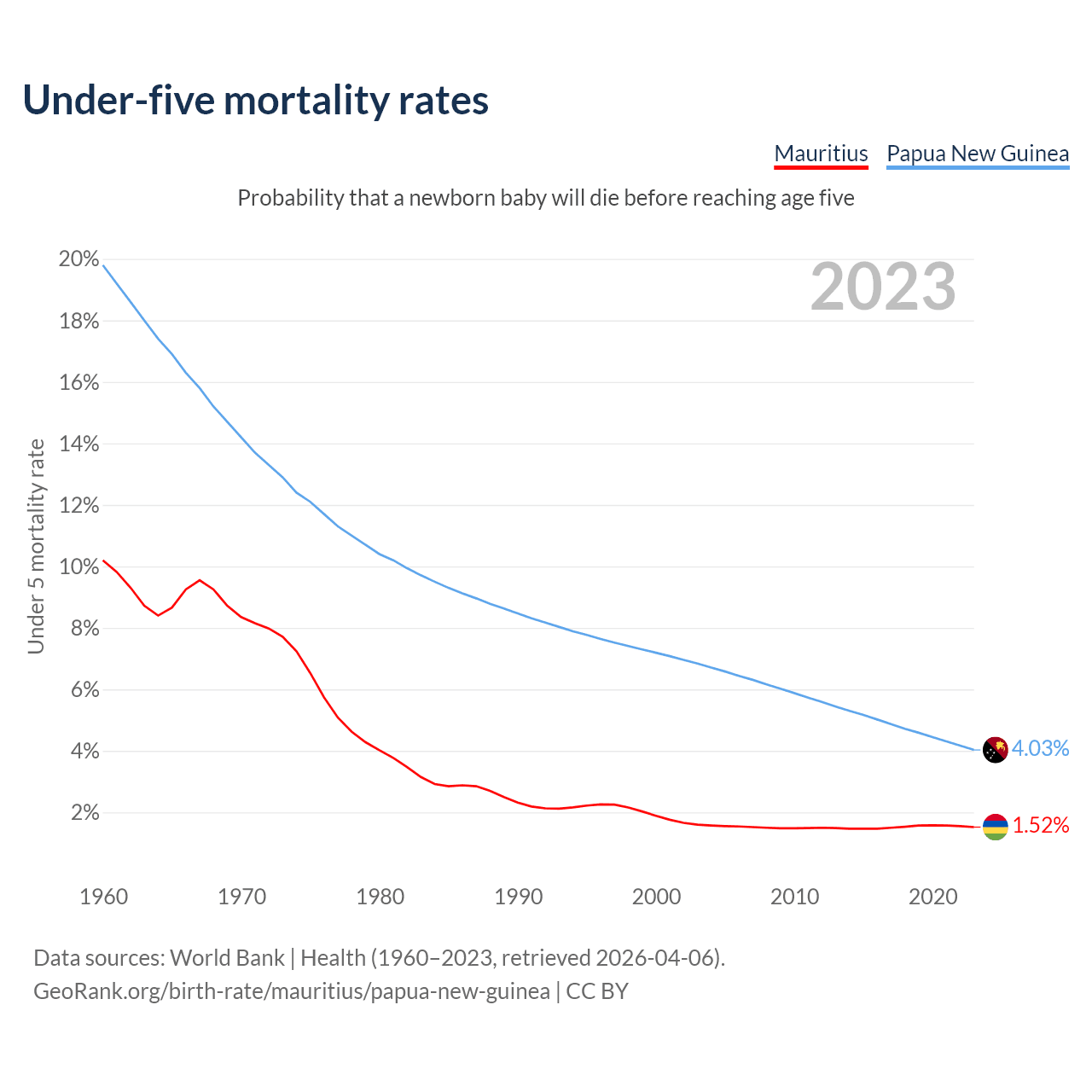 The chance that a newborn baby will die before reaching age five is 1.52% in Mauritius and 4.03% in Papua New Guinea. Above is a chart with historical data on under-five mortality rates.