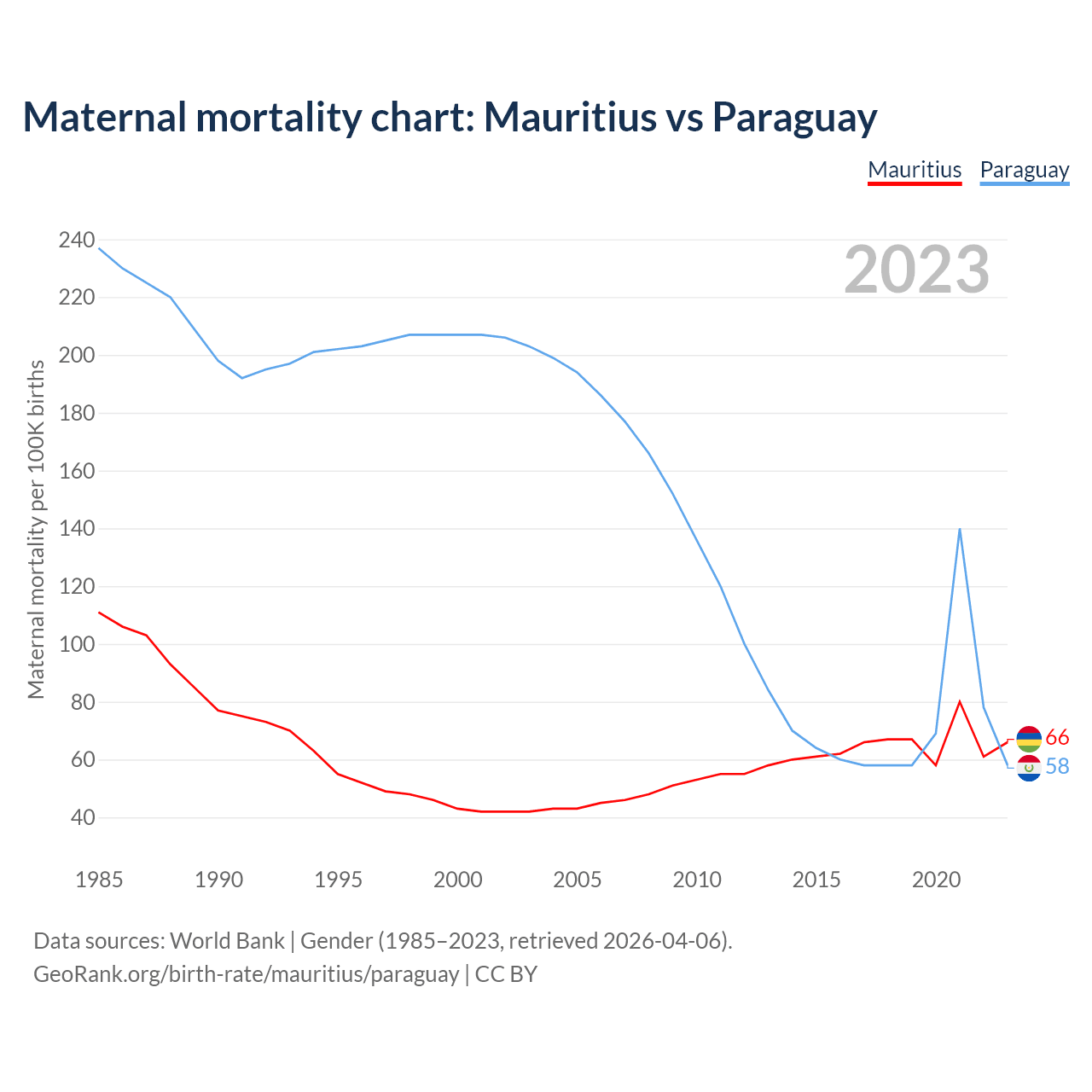 The maternal mortality rate, which is the probability of dying during childbirth or within 42 days of pregnancy termination, is 66 deaths per 100,000 live births in Mauritius, compared to 58 deaths in Paraguay.