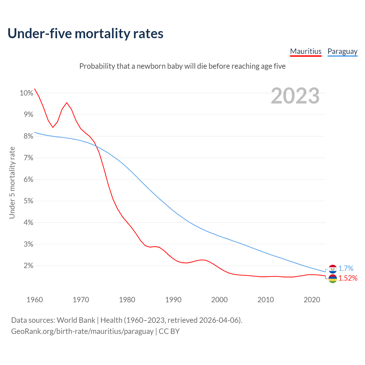 The chance that a newborn baby will die before reaching age five is 1.52% in Mauritius and 1.7% in Paraguay. Above is a chart with historical data on under-five mortality rates.