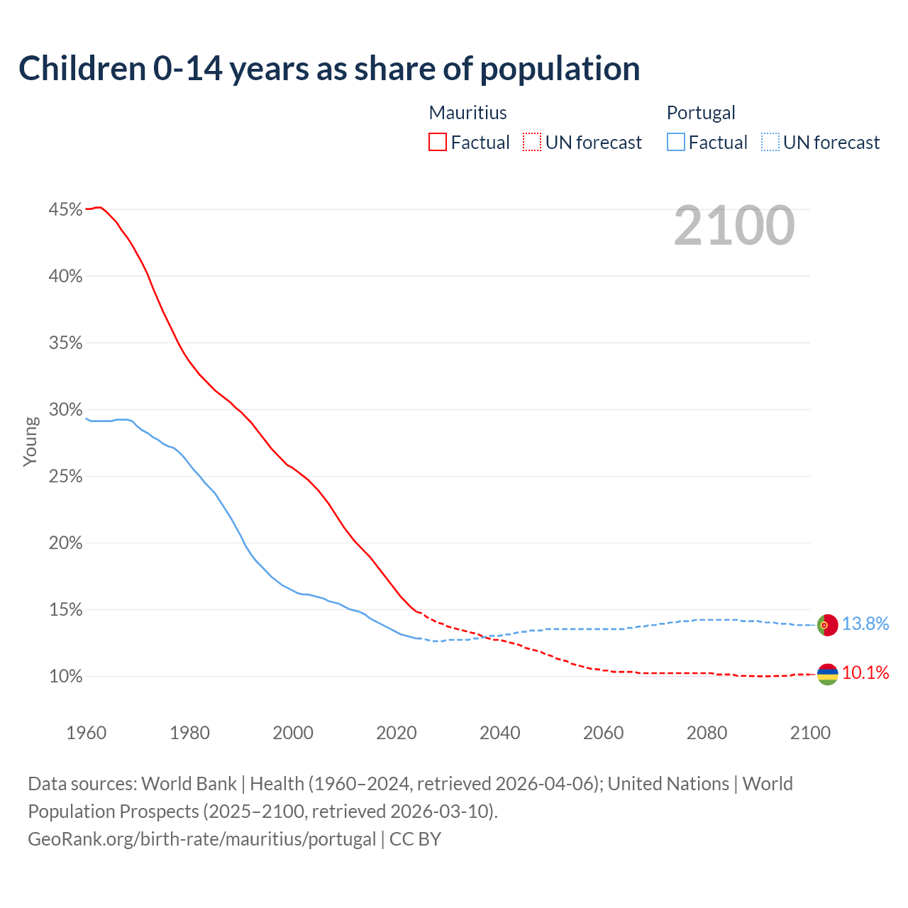 According to the latest available data on birth rates, the fertility rate in Mauritius was 1.39 children per woman in 2023, compared to 1.44 in Portugal in 2023. The replacement level is considered to be 2.1 children per woman.