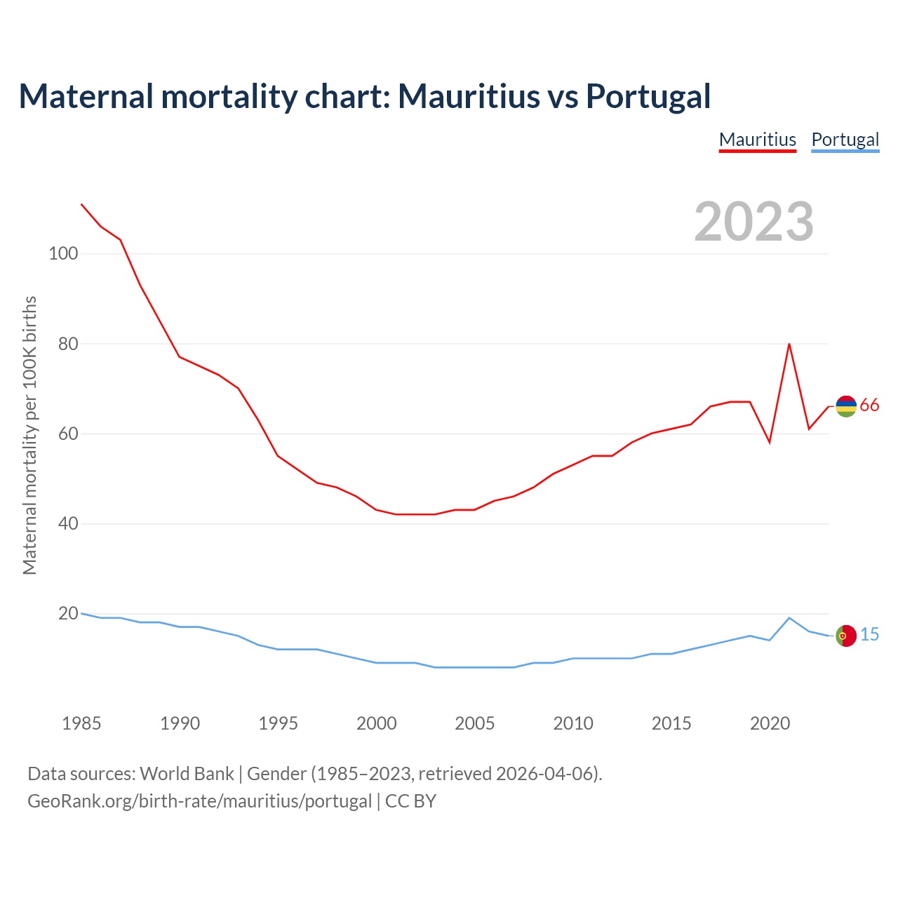 The maternal mortality rate, which is the probability of dying during childbirth or within 42 days of pregnancy termination, is 66 deaths per 100,000 live births in Mauritius, compared to 15 deaths in Portugal.