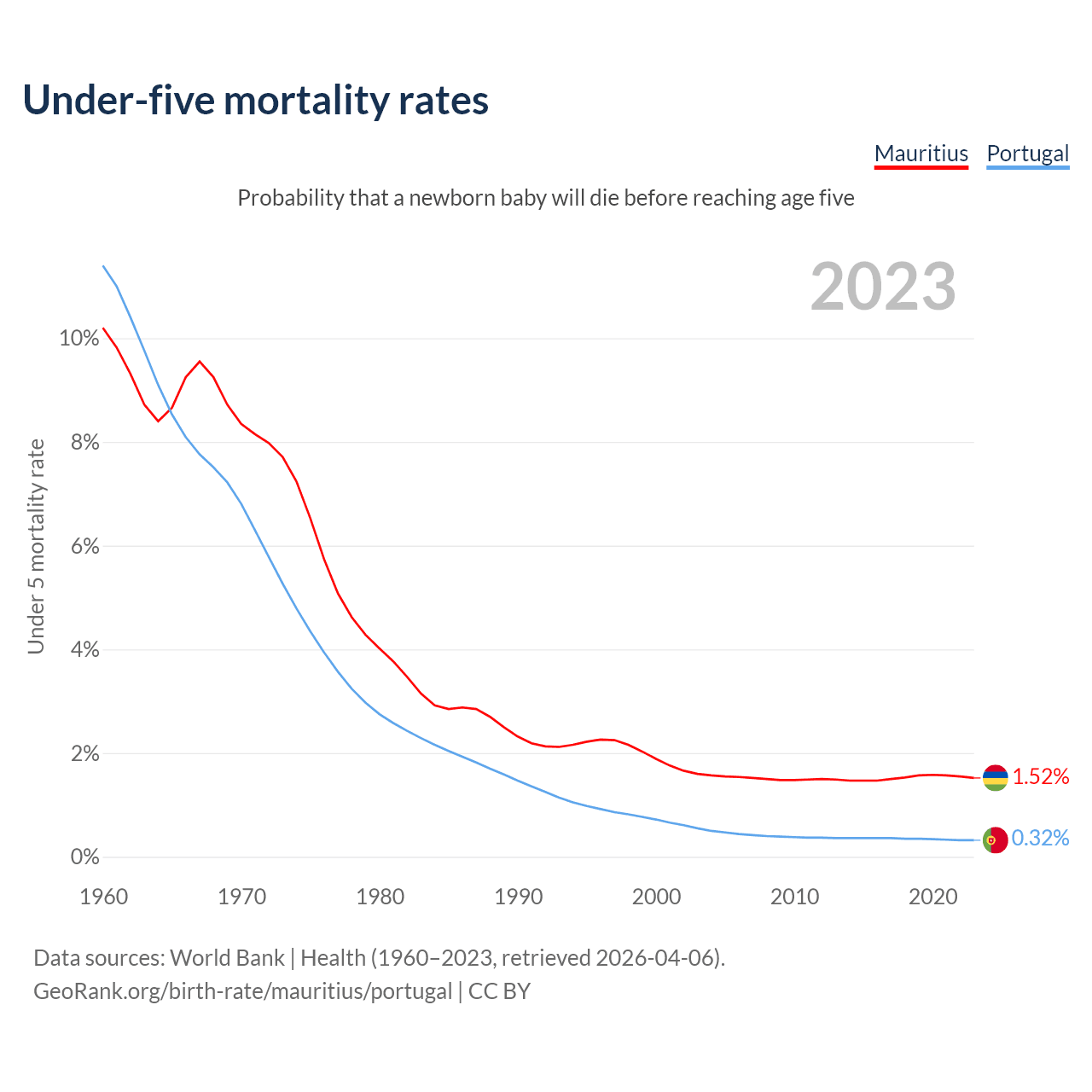 The chance that a newborn baby will die before reaching age five is 1.52% in Mauritius and 0.32% in Portugal. Above is a chart with historical data on under-five mortality rates.