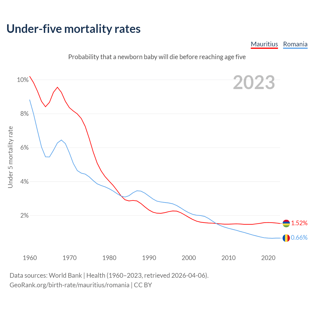 The chance that a newborn baby will die before reaching age five is 1.52% in Mauritius and 0.66% in Romania. Above is a chart with historical data on under-five mortality rates.