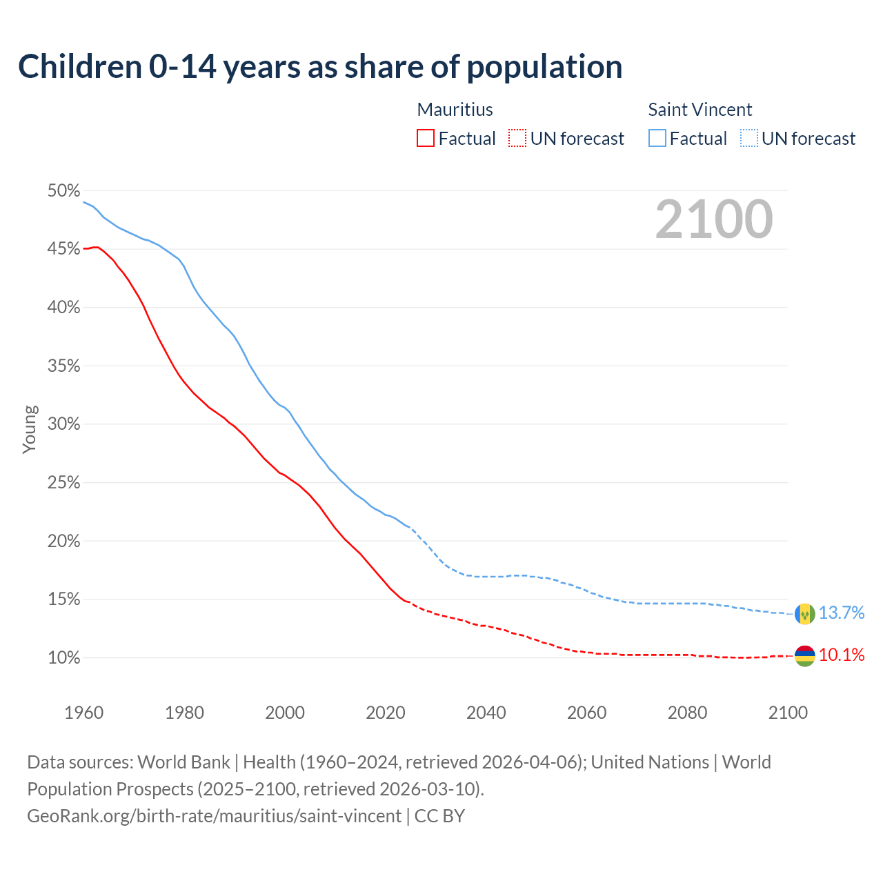 According to the latest available data on birth rates, the fertility rate in Mauritius was 1.39 children per woman in 2023, compared to 1.78 in Saint Vincent in 2023. The replacement level is considered to be 2.1 children per woman.