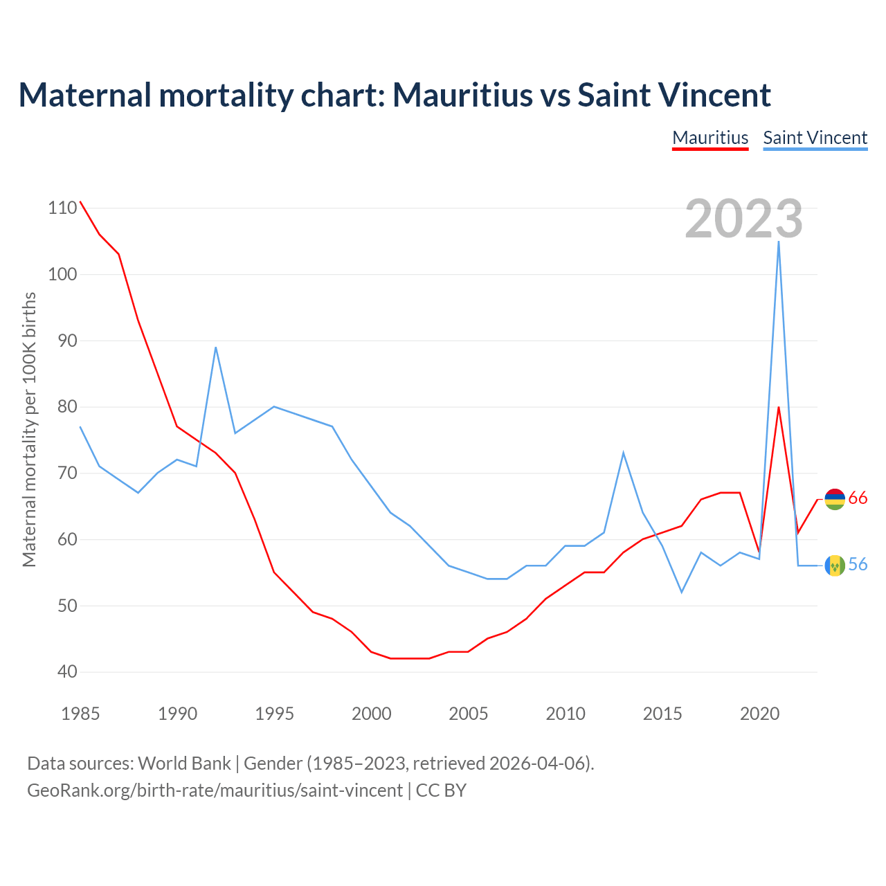 The maternal mortality rate, which is the probability of dying during childbirth or within 42 days of pregnancy termination, is 66 deaths per 100,000 live births in Mauritius, compared to 56 deaths in Saint Vincent.