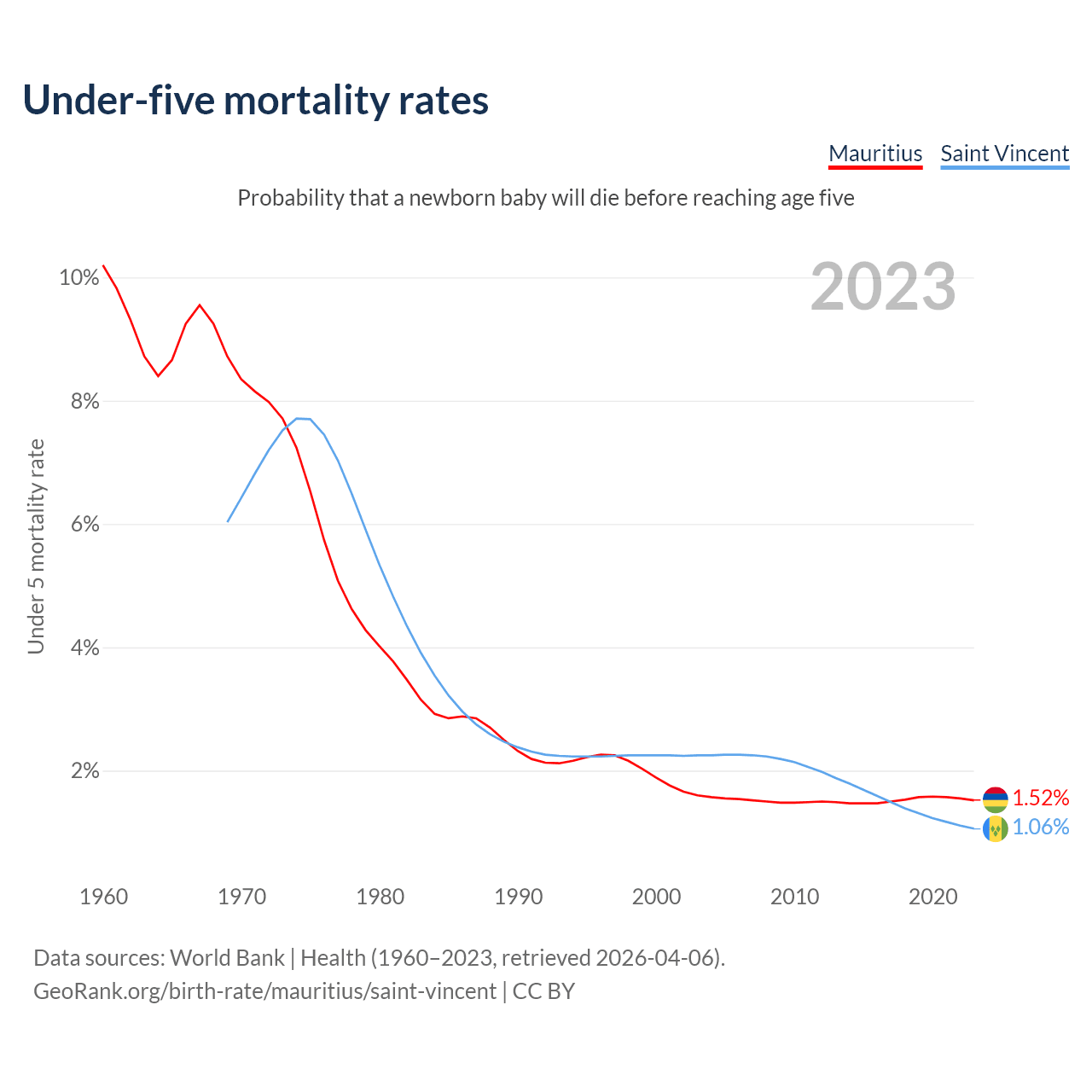 The chance that a newborn baby will die before reaching age five is 1.52% in Mauritius and 1.06% in Saint Vincent. Above is a chart with historical data on under-five mortality rates.