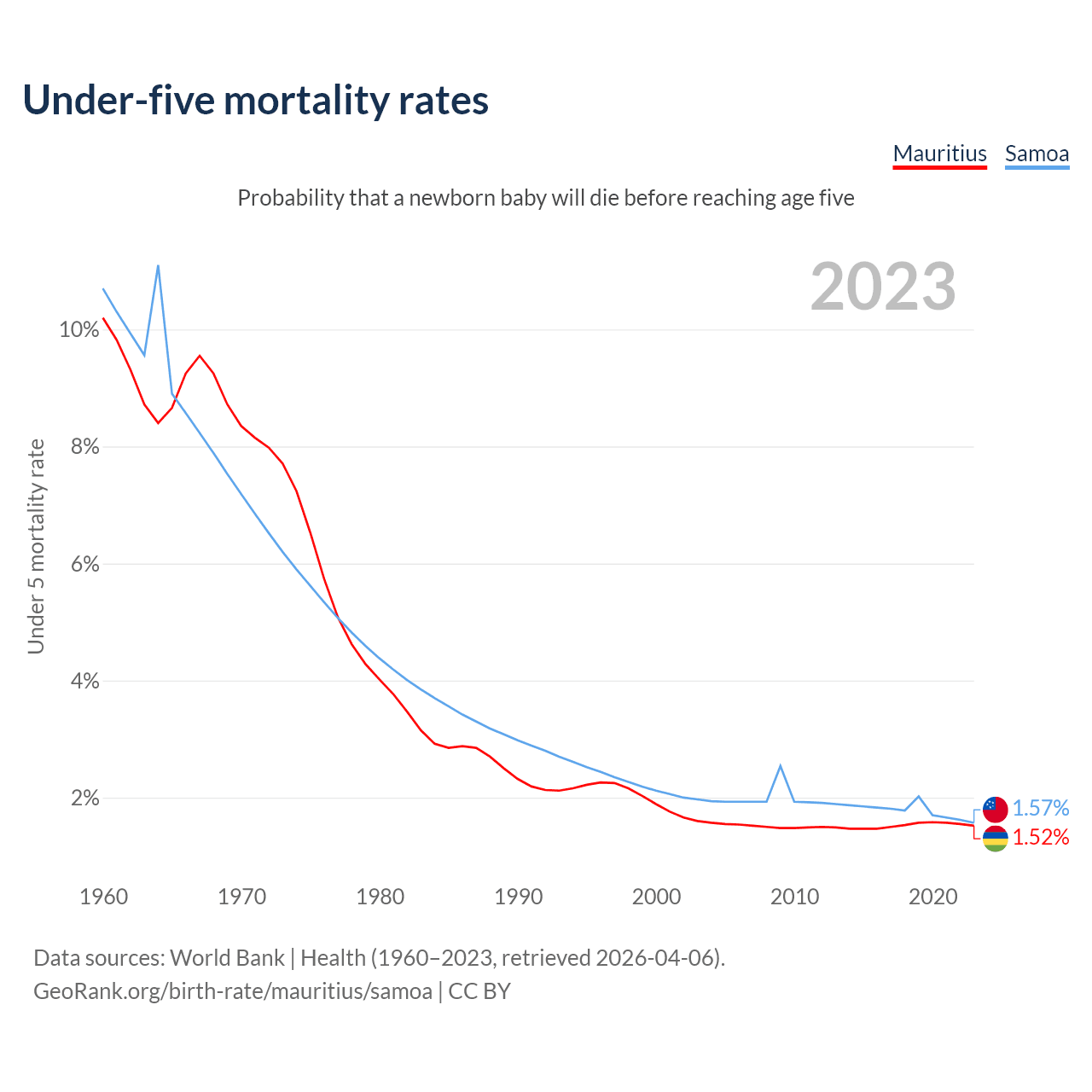 The chance that a newborn baby will die before reaching age five is 1.52% in Mauritius and 1.57% in Samoa. Above is a chart with historical data on under-five mortality rates.