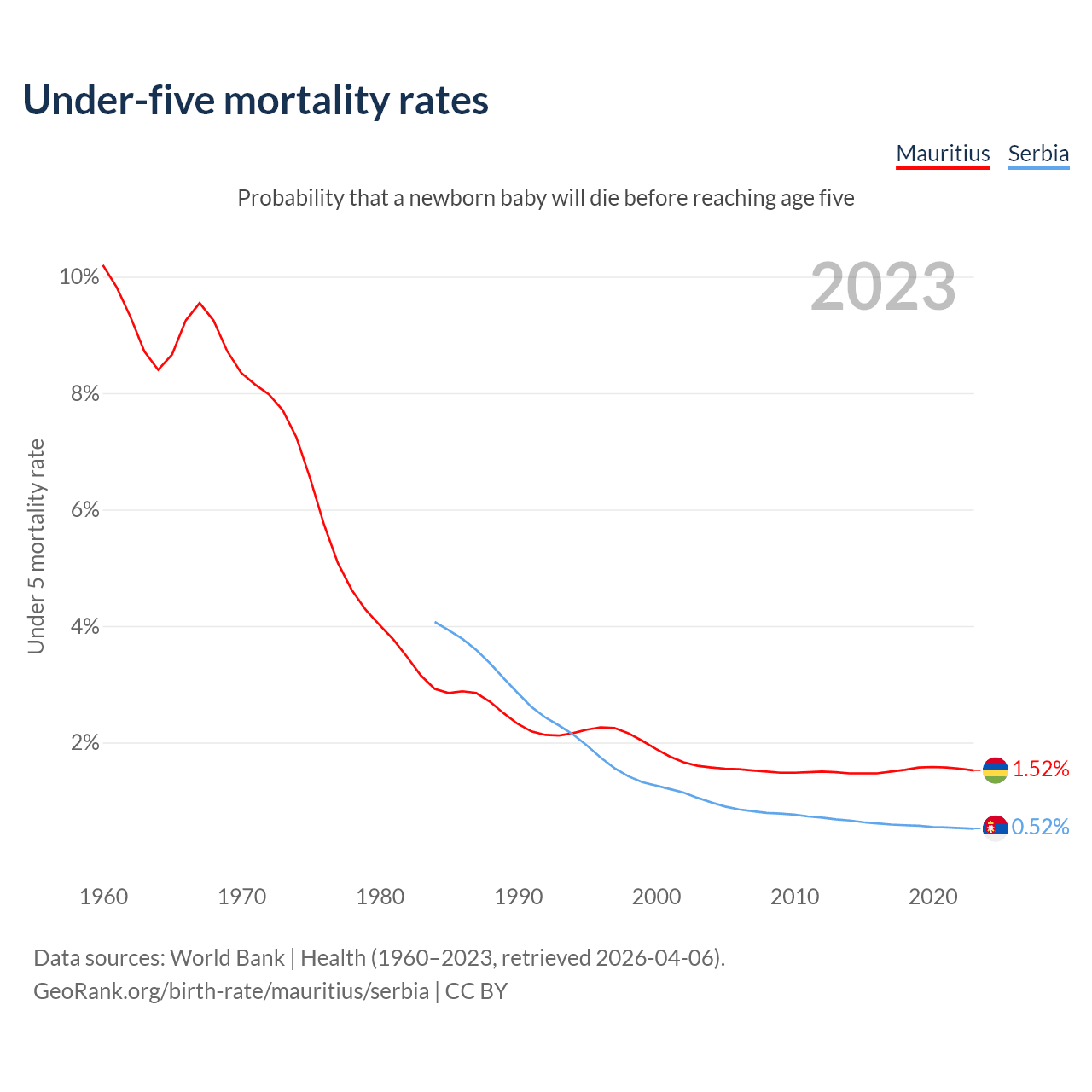 The chance that a newborn baby will die before reaching age five is 1.52% in Mauritius and 0.52% in Serbia. Above is a chart with historical data on under-five mortality rates.