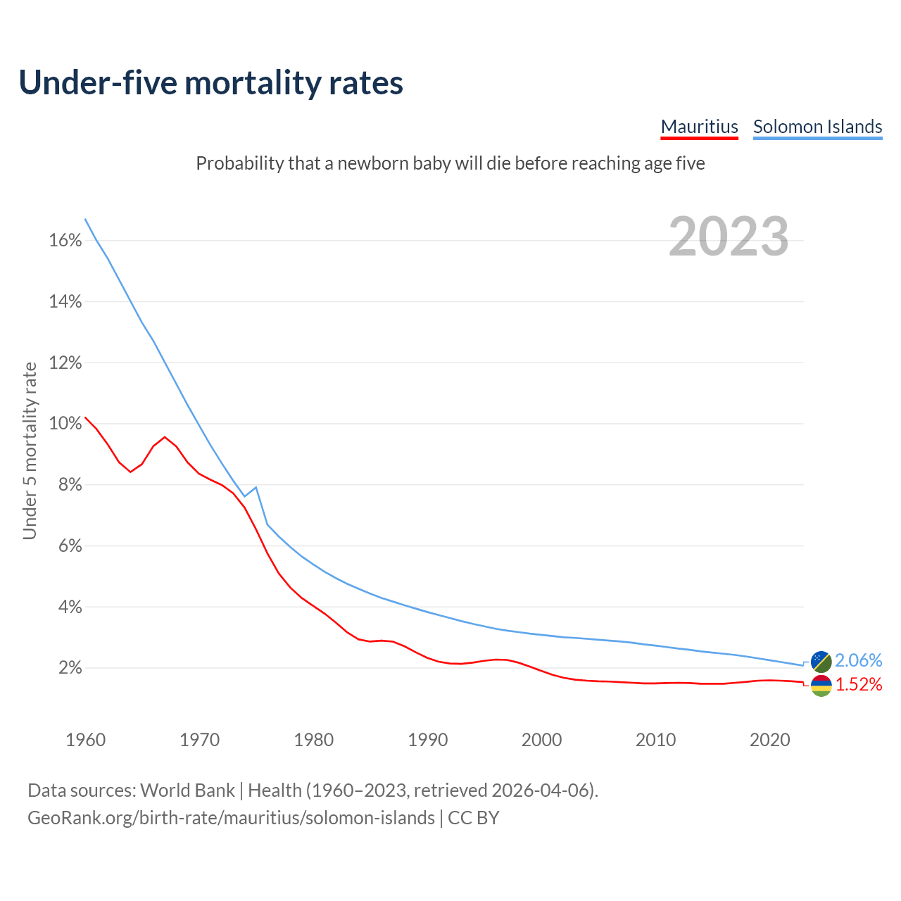 The chance that a newborn baby will die before reaching age five is 1.52% in Mauritius and 2.06% in the Solomon Islands. Above is a chart with historical data on under-five mortality rates.