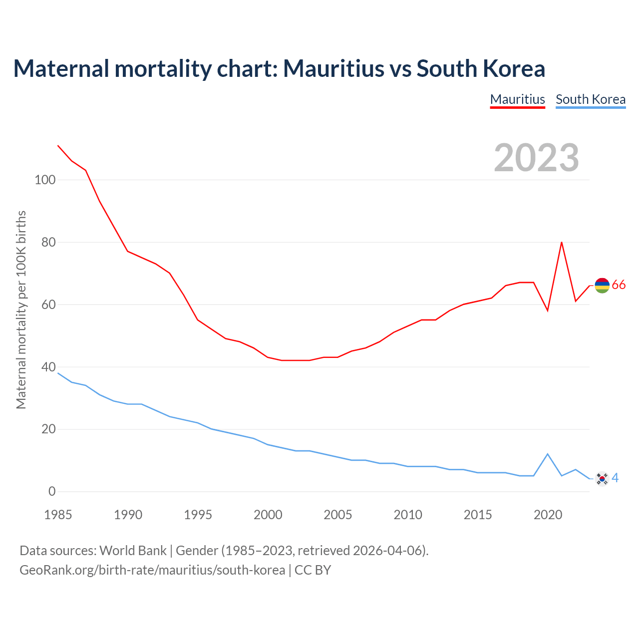 The maternal mortality rate, which is the probability of dying during childbirth or within 42 days of pregnancy termination, is 66 deaths per 100,000 live births in Mauritius, compared to 4 deaths in South Korea.