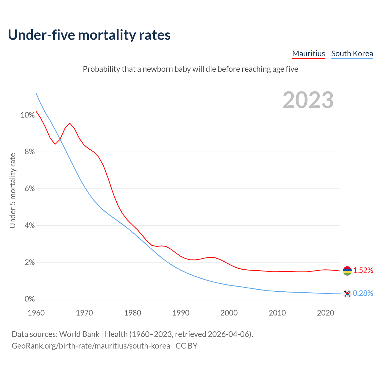 The chance that a newborn baby will die before reaching age five is 1.52% in Mauritius and 0.28% in South Korea. Above is a chart with historical data on under-five mortality rates.