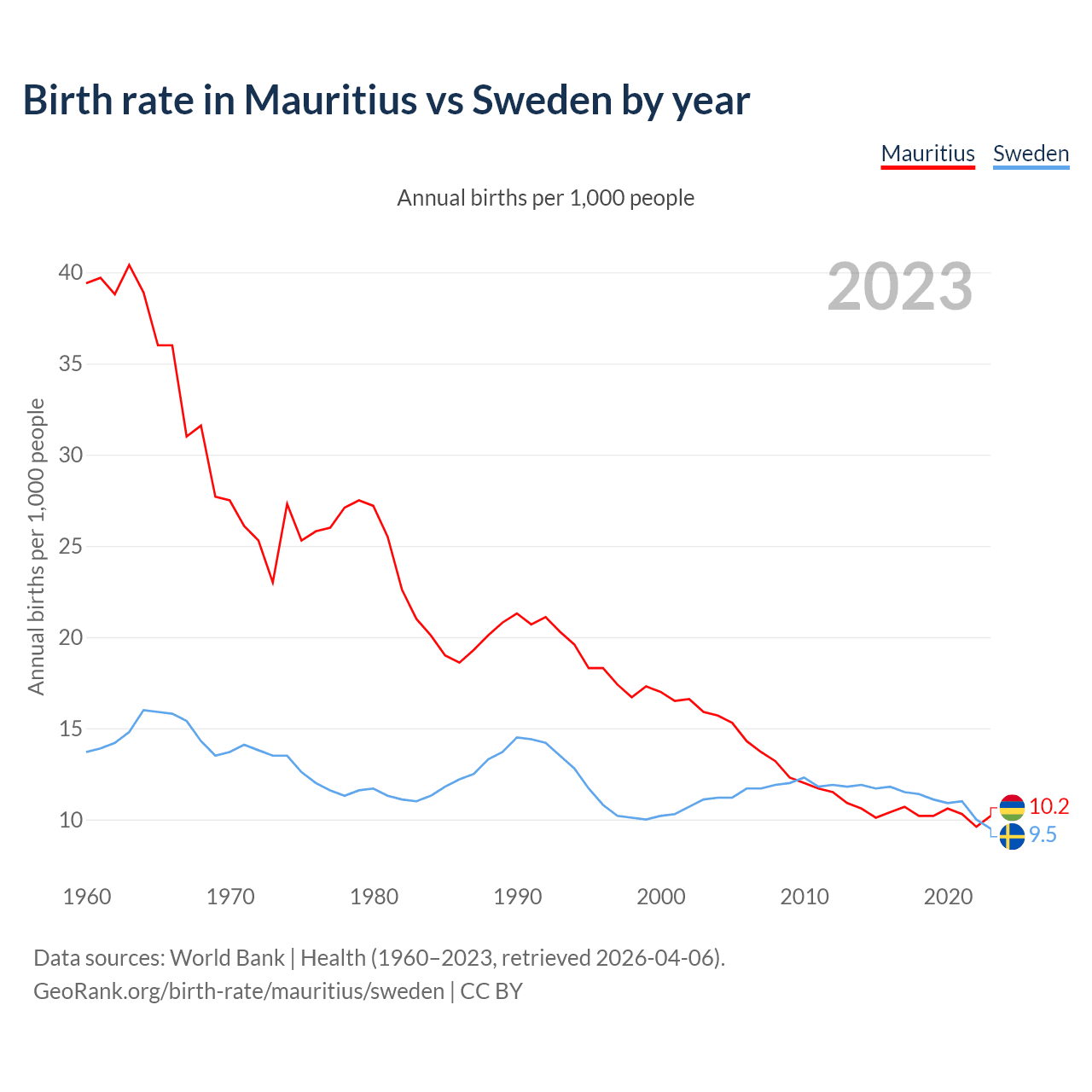 Mauritius has an annual birth rate of 10.2 births per 1,000 people, compared to 9.5 for Sweden. The average number of children a woman is expected to have during her lifetime — the fertility rate, is 1.39 in Mauritius and 1.45 in Sweden — 4.32% difference.