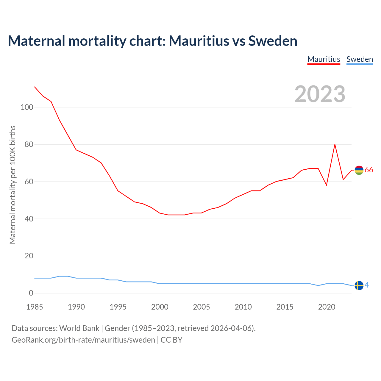 The maternal mortality rate, which is the probability of dying during childbirth or within 42 days of pregnancy termination, is 66 deaths per 100,000 live births in Mauritius, compared to 4 deaths in Sweden.
