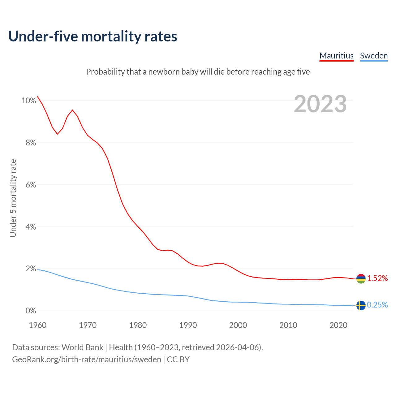 The chance that a newborn baby will die before reaching age five is 1.52% in Mauritius and 0.25% in Sweden. Above is a chart with historical data on under-five mortality rates.