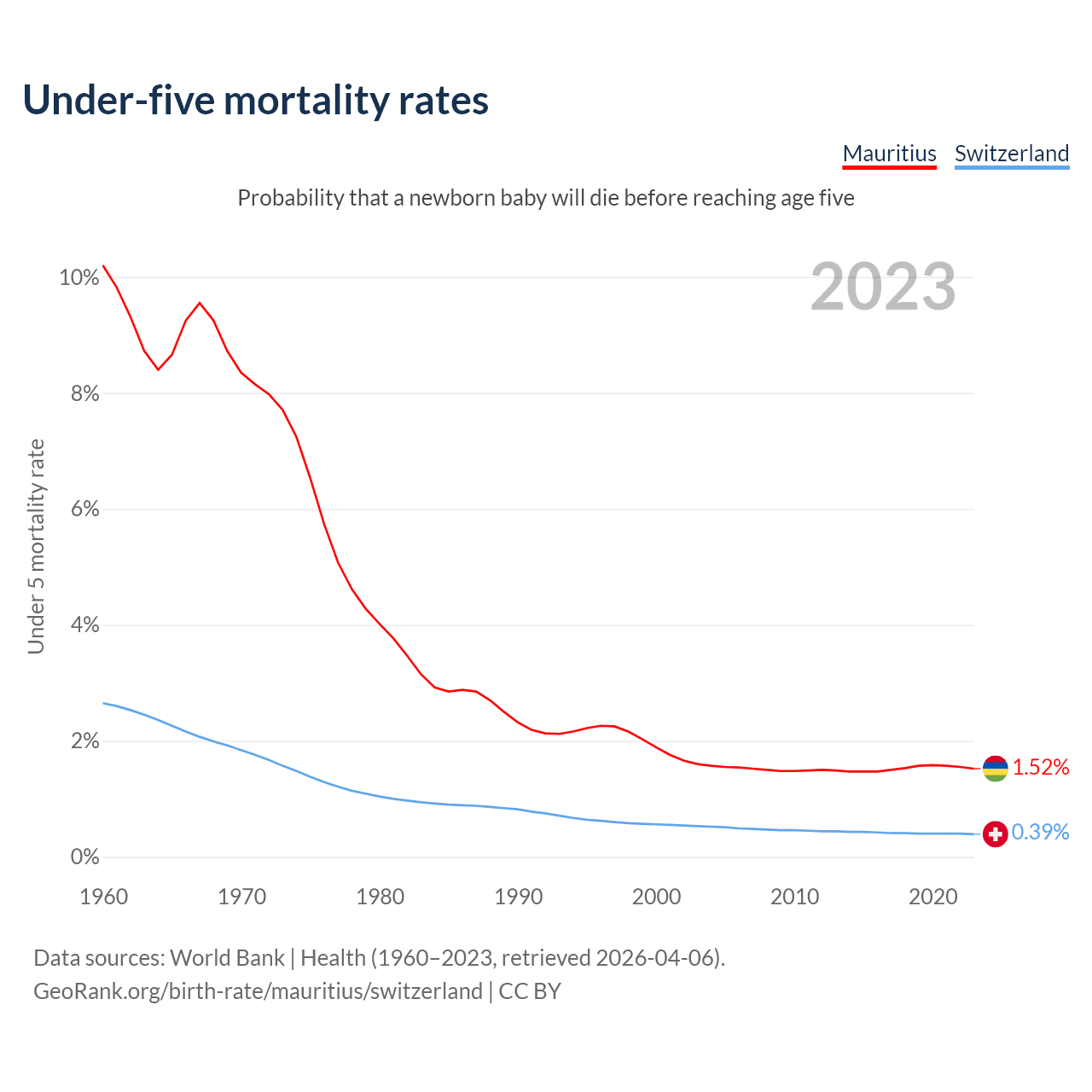 The chance that a newborn baby will die before reaching age five is 1.52% in Mauritius and 0.39% in Switzerland. Above is a chart with historical data on under-five mortality rates.