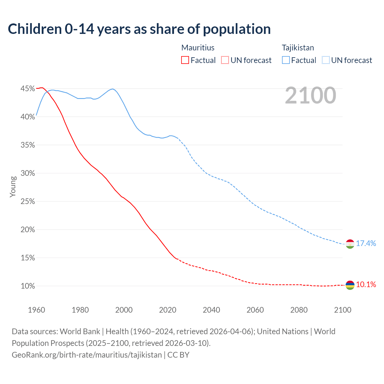 According to the latest available data on birth rates, the fertility rate in Mauritius was 1.39 children per woman in 2023, compared to 3.07 in Tajikistan in 2023. The replacement level is considered to be 2.1 children per woman.
