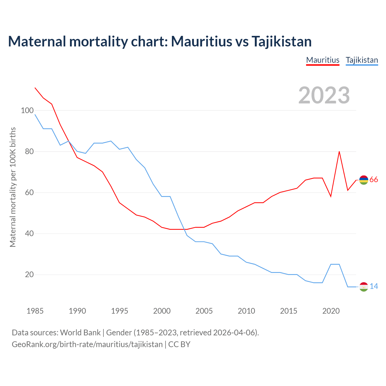 The maternal mortality rate, which is the probability of dying during childbirth or within 42 days of pregnancy termination, is 66 deaths per 100,000 live births in Mauritius, compared to 14 deaths in Tajikistan.