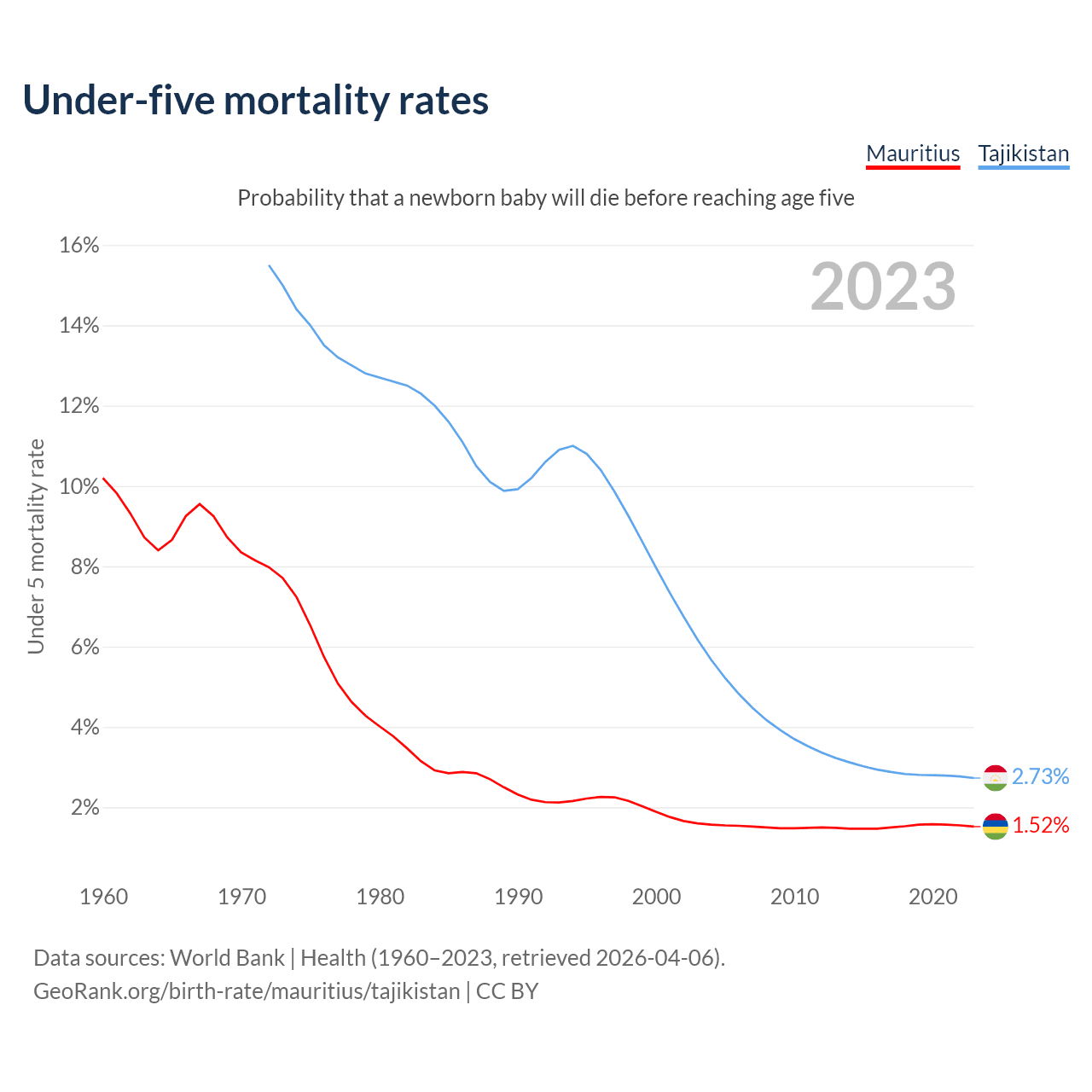 The chance that a newborn baby will die before reaching age five is 1.52% in Mauritius and 2.73% in Tajikistan. Above is a chart with historical data on under-five mortality rates.