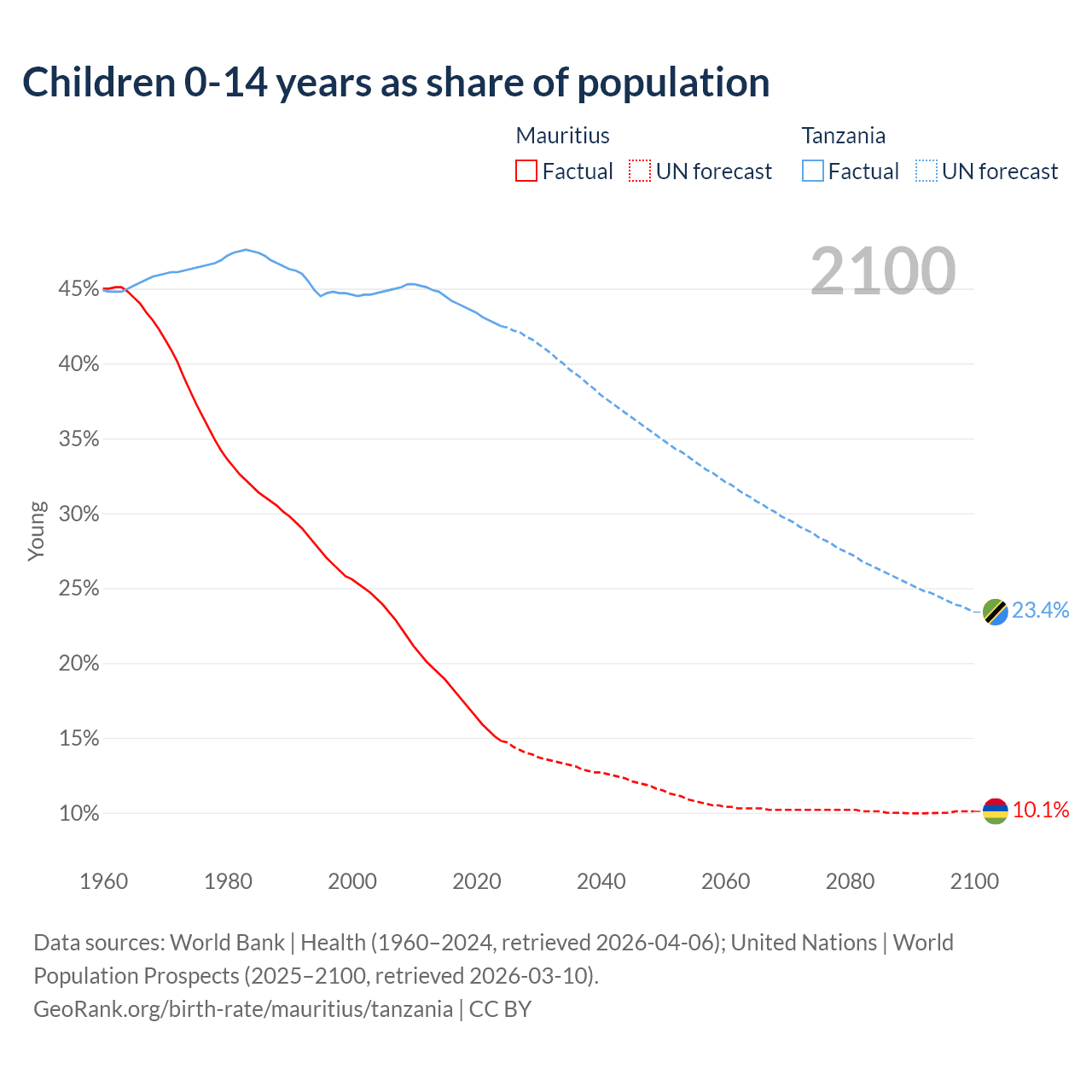 According to the latest available data on birth rates, the fertility rate in Mauritius was 1.39 children per woman in 2023, compared to 4.61 in Tanzania in 2023. The replacement level is considered to be 2.1 children per woman.