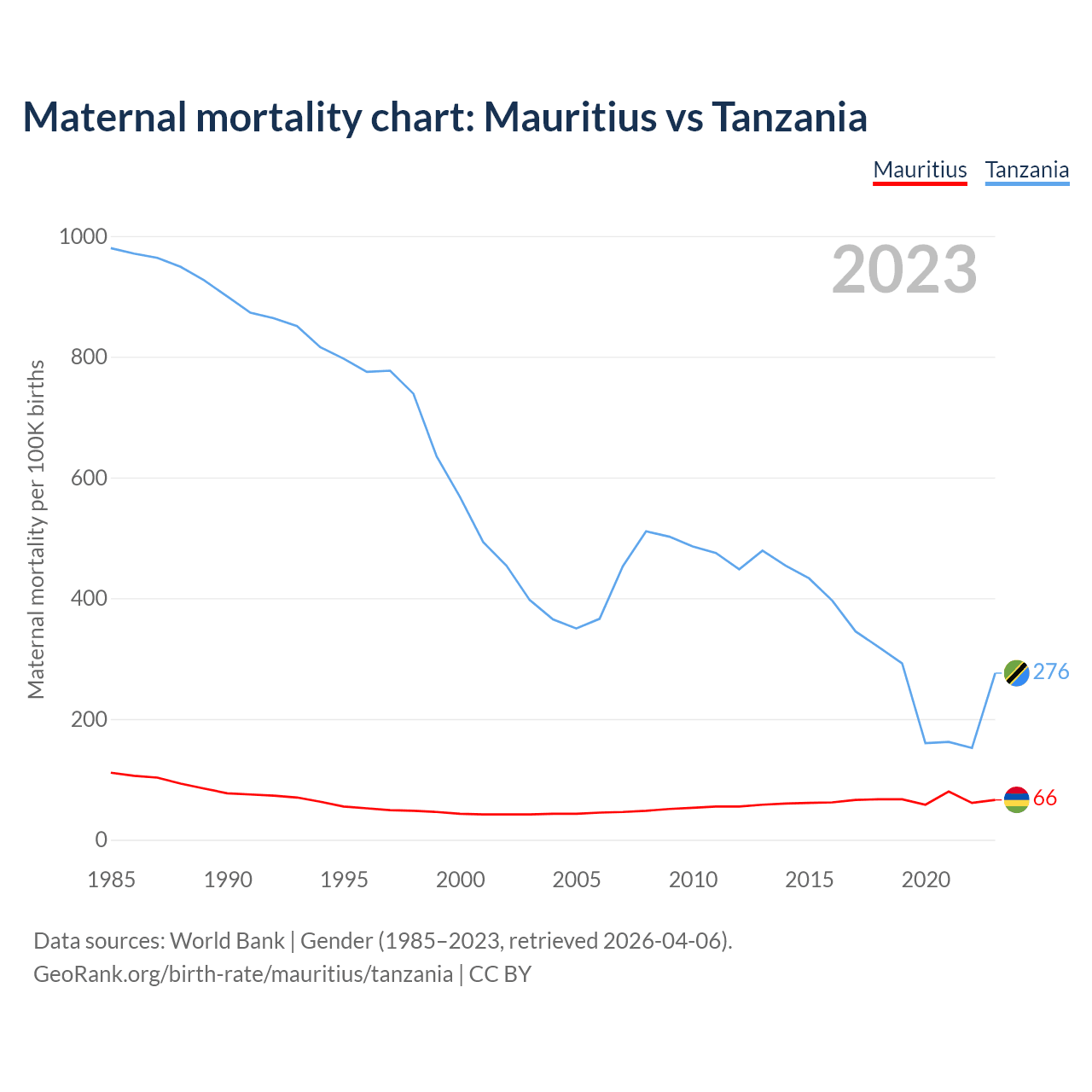 The maternal mortality rate, which is the probability of dying during childbirth or within 42 days of pregnancy termination, is 66 deaths per 100,000 live births in Mauritius, compared to 276 deaths in Tanzania.