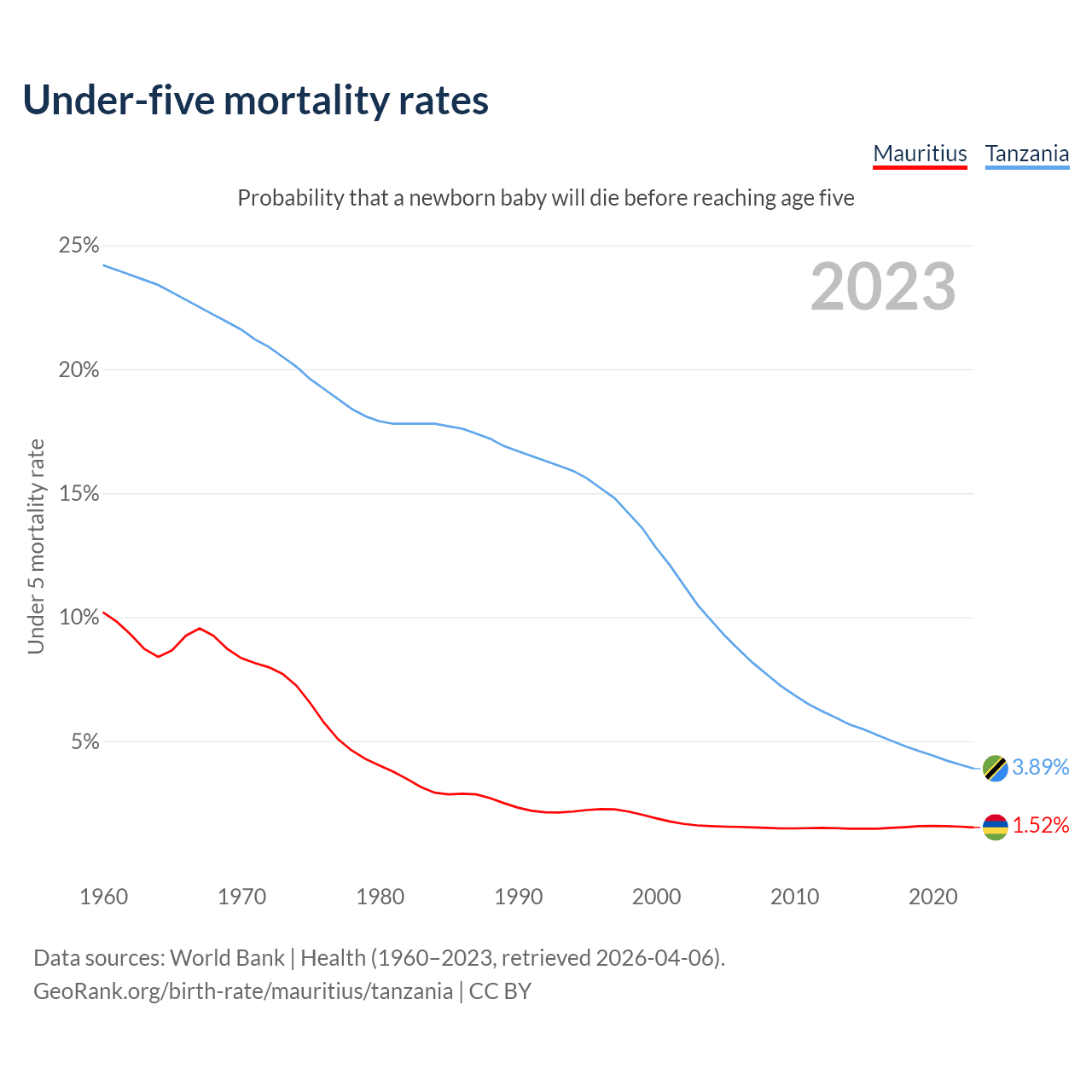 The chance that a newborn baby will die before reaching age five is 1.52% in Mauritius and 3.89% in Tanzania. Above is a chart with historical data on under-five mortality rates.