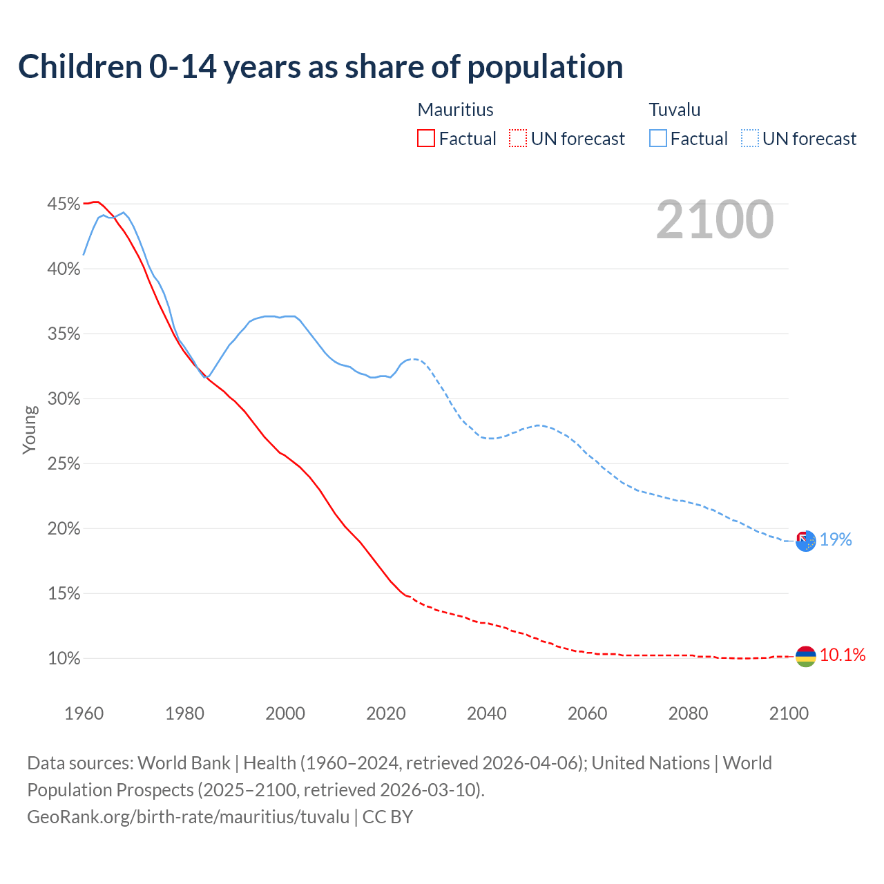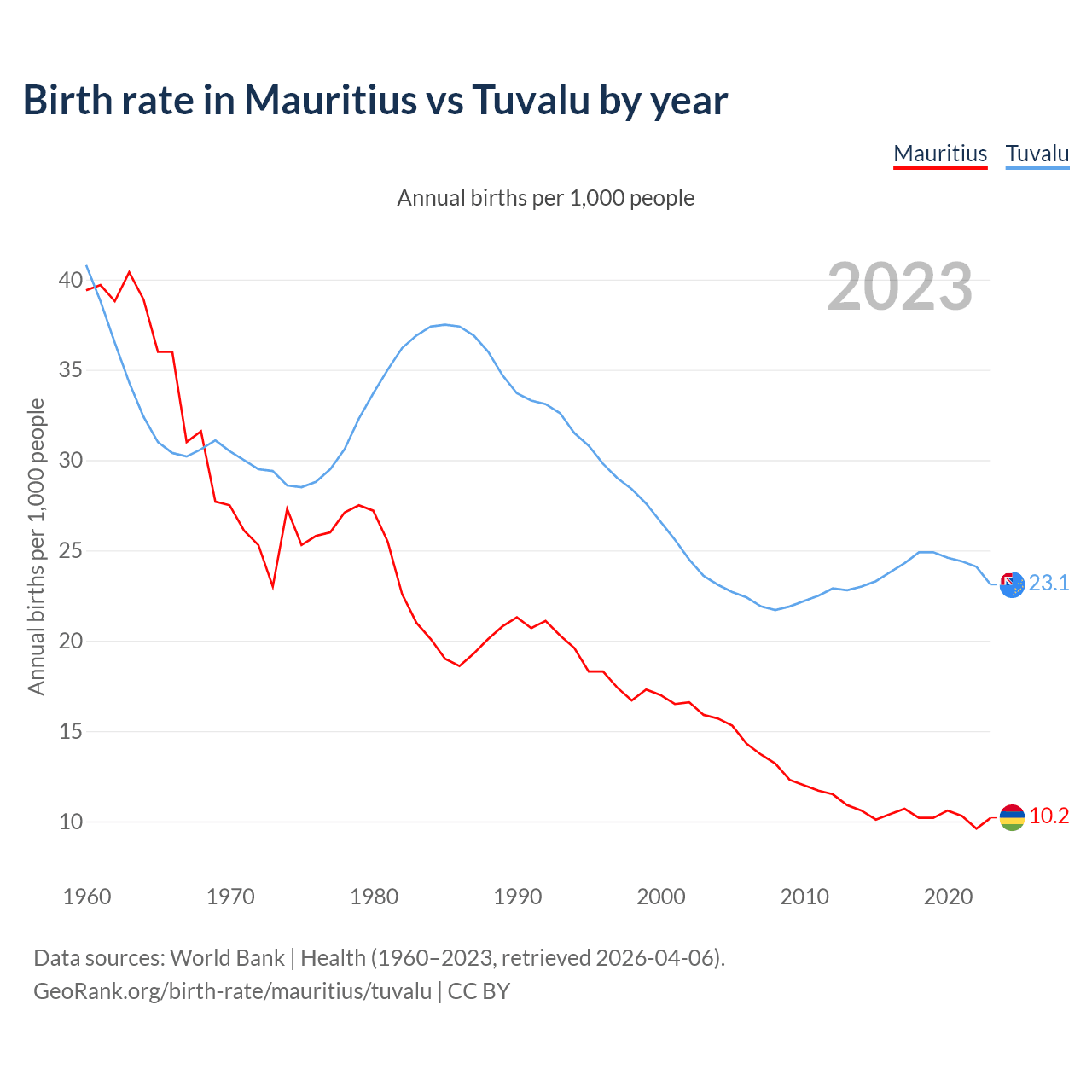 Mauritius has an annual birth rate of 10.2 births per 1,000 people, compared to 23.1 for Tuvalu. The average number of children a woman is expected to have during her lifetime — the fertility rate, is 1.39 in Mauritius and 3.21 in Tuvalu — 130.8% difference.