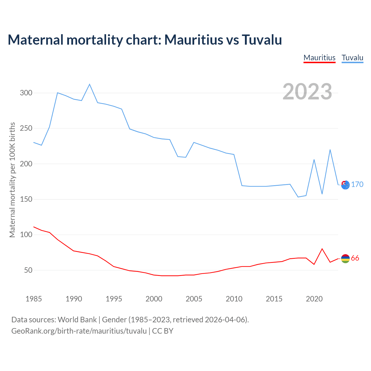 The maternal mortality rate, which is the probability of dying during childbirth or within 42 days of pregnancy termination, is 66 deaths per 100,000 live births in Mauritius, compared to 170 deaths in Tuvalu.