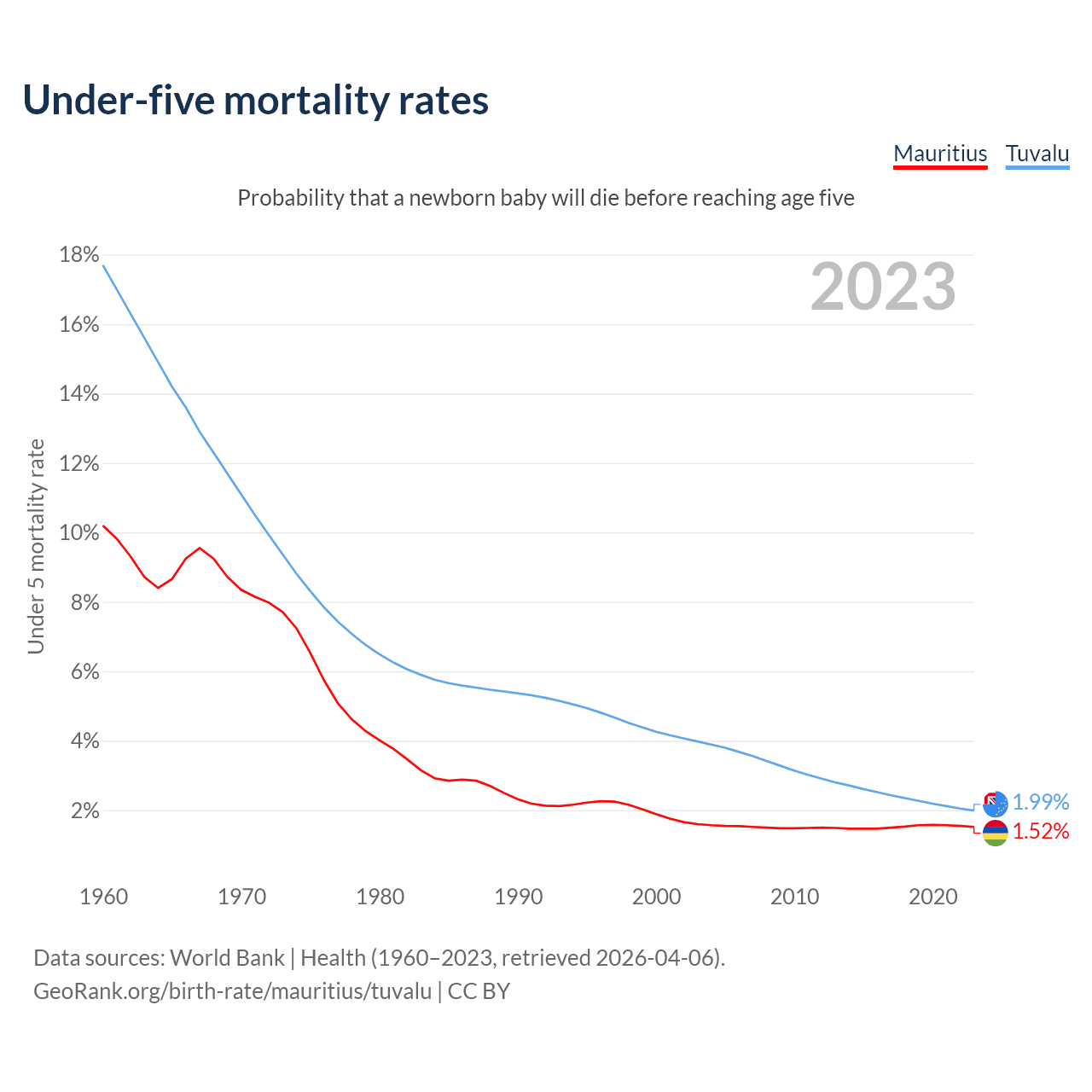 The chance that a newborn baby will die before reaching age five is 1.52% in Mauritius and 1.99% in Tuvalu. Above is a chart with historical data on under-five mortality rates.