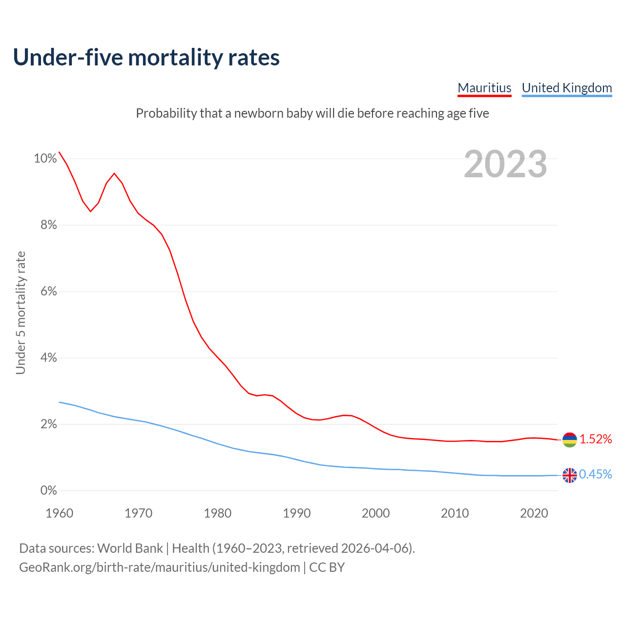 The chance that a newborn baby will die before reaching age five is 1.52% in Mauritius and 0.45% in the United Kingdom. Above is a chart with historical data on under-five mortality rates.