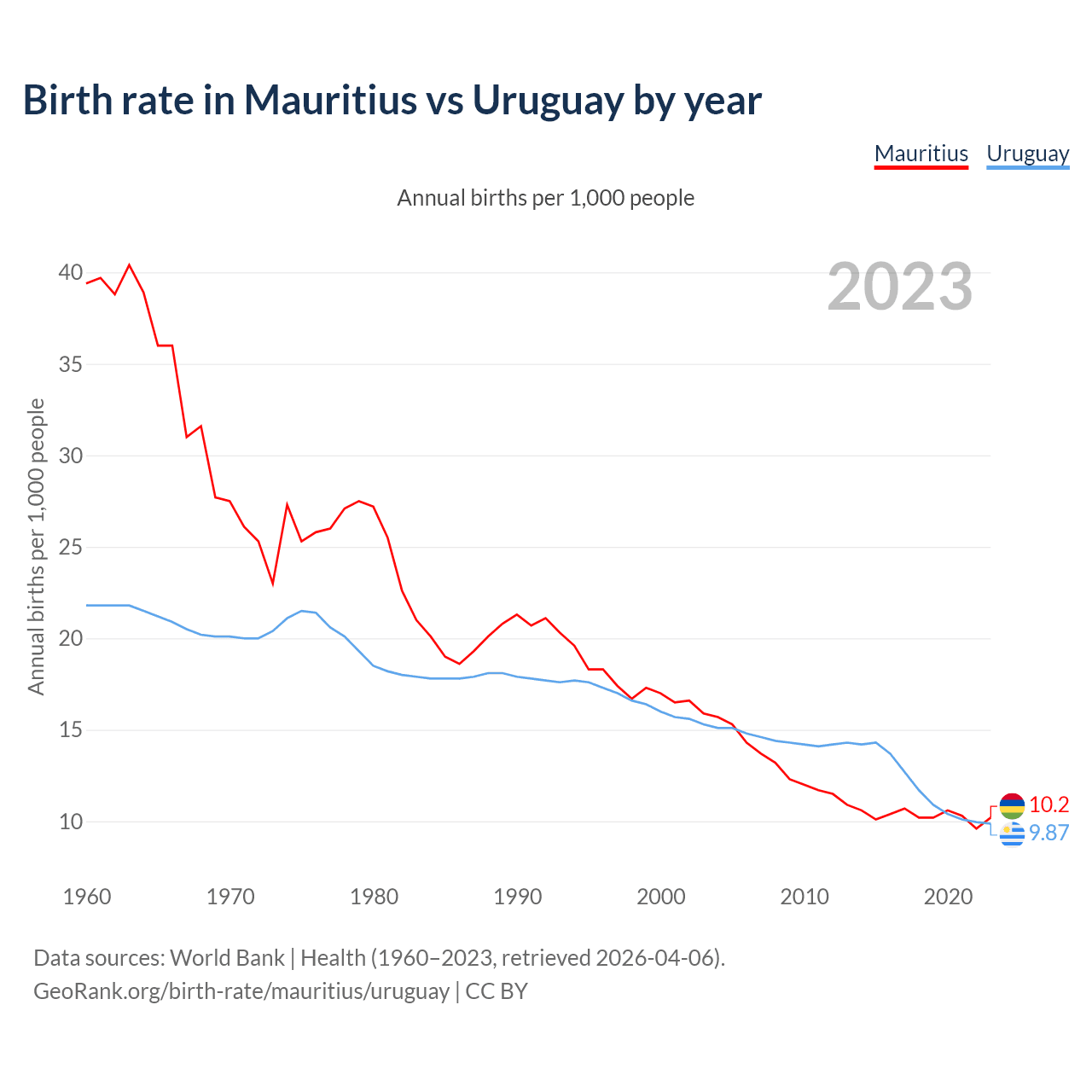 Mauritius has an annual birth rate of 10.2 births per 1,000 people, compared to 9.87 for Uruguay. The average number of children a woman is expected to have during her lifetime — the fertility rate, is 1.39 in Mauritius and 1.41 in Uruguay — 1.37% difference.