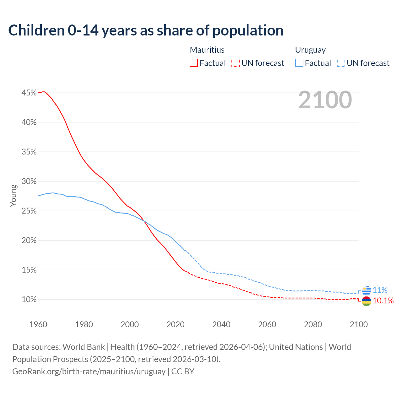 According to the latest available data on birth rates, the fertility rate in Mauritius was 1.39 children per woman in 2023, compared to 1.41 in Uruguay in 2023. The replacement level is considered to be 2.1 children per woman.